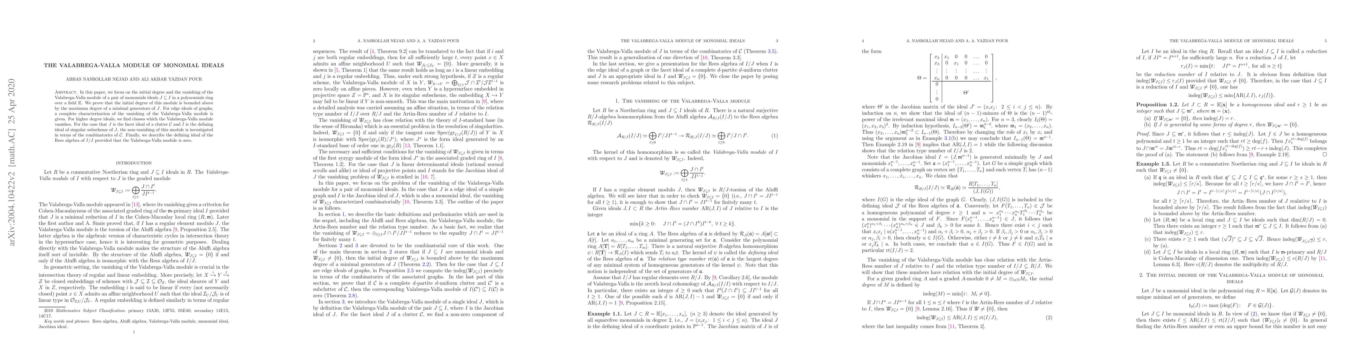 In this paper, we focus on the initial degree and the vanishing of the Valabrega-Valla module of a pair of monomials ideals $J\subseteq I$ in a polynomials ring over a field $\mathbb{K}$. We prove that the initial degree of this module is bounded above by the maximum degree of a minimal generators of $J$. For edge ideals of graphs, a complete characterization of the vanishing of the Valabrega-Valla module is given. For higher degree ideals, we find classes which the Valabrega-Valla module vanishes. For the case that $J$ is the facet ideal of a clutter $\mathcal{C}$ and $I$ is the defining ideal of singular subscheme of $J$, the non-vanishing of this module is investigated in terms of the combinatorics of $\mathcal{C}$. Finally, we describe the defining ideal of the Rees algebra of $I/J$ provided that the Valabrega-Valla module is zero.