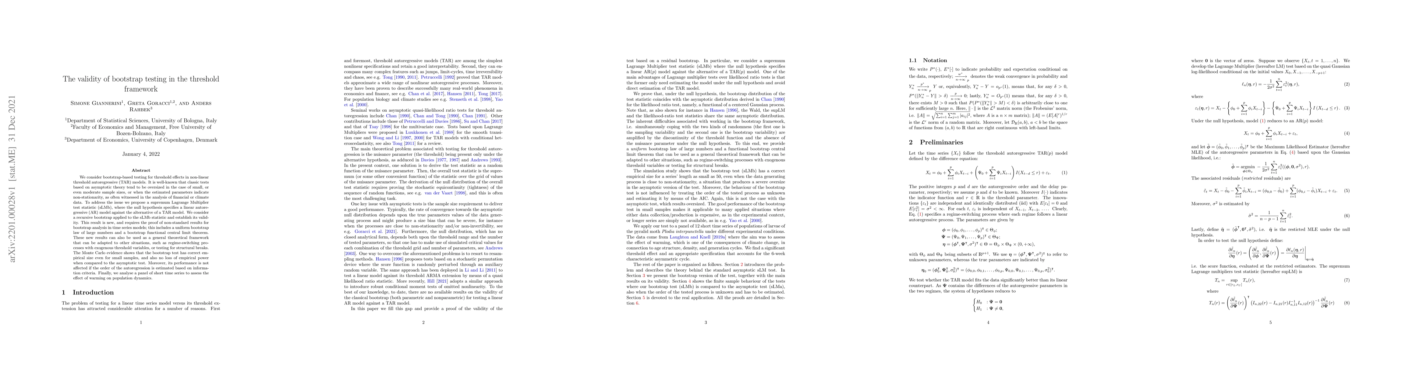 The research investigates bootstrap-based testing for threshold effects in non-linear threshold autoregressive (TAR) models, addressing the oversizing issue of classic tests with small or moderate sample sizes and non-stationarity indications often seen in financial or climate data. A supremum Lagrange Multiplier test statistic (sLMb) is proposed, with the null hypothesis specifying a linear autoregressive (AR) model against the alternative of a TAR model. The validity of a recursive bootstrap applied to the sLMb statistic is established.