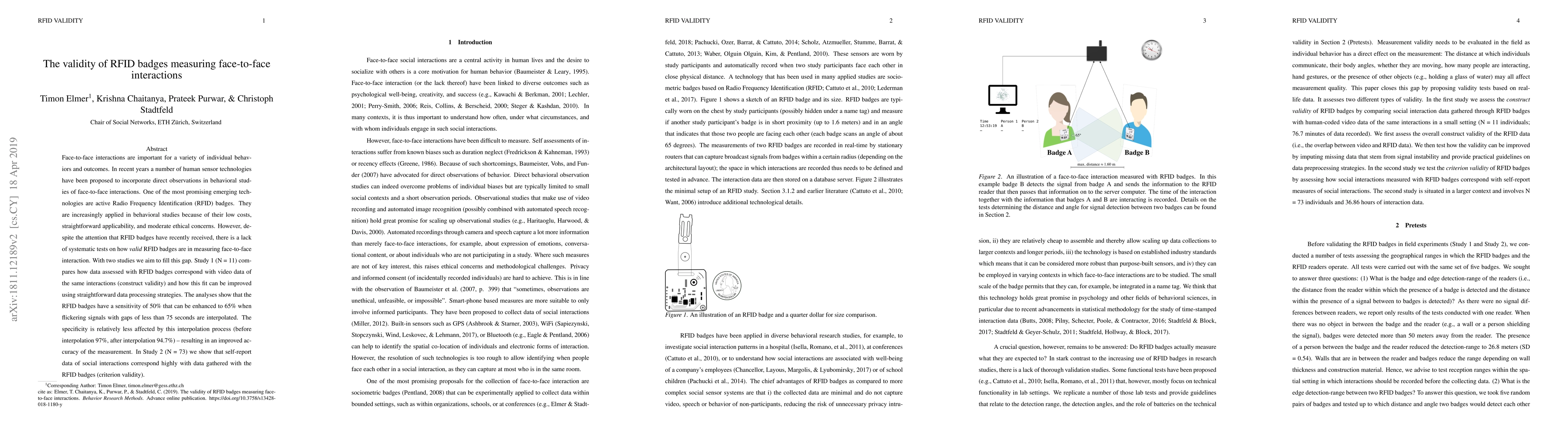 Face-to-face interactions are important for a variety of individual behaviors and outcomes. In recent years a number of human sensor technologies have been proposed to incorporate direct observations in behavioral studies of face-to-face interactions. One of the most promising emerging technologies are active Radio Frequency Identification (RFID) badges. They are increasingly applied in behavioral studies because of their low costs, straightforward applicability, and moderate ethical concerns. However, despite the attention that RFID badges have recently received, there is a lack of systematic tests on how valid RFID badges are in measuring face-to-face interaction. With two studies we aim to fill this gap. Study 1 (N = 11) compares how data assessed with RFID badges correspond with video data of the same interactions (construct validity) and how this fit can be improved using straightforward data processing strategies. The analyses show that the RFID badges have a sensitivity of 50% that can be enhanced to 65% when flickering signals with gaps of less than 75 seconds are interpolated. The specificity is relatively less affected by this interpolation process (before interpolation 97%, after interpolation 94.7%) - resulting in an improved accuracy of the measurement. In Study 2 (N = 73) we show that self-report data of social interactions correspond highly with data gathered with the RFID badges (criterion validity).