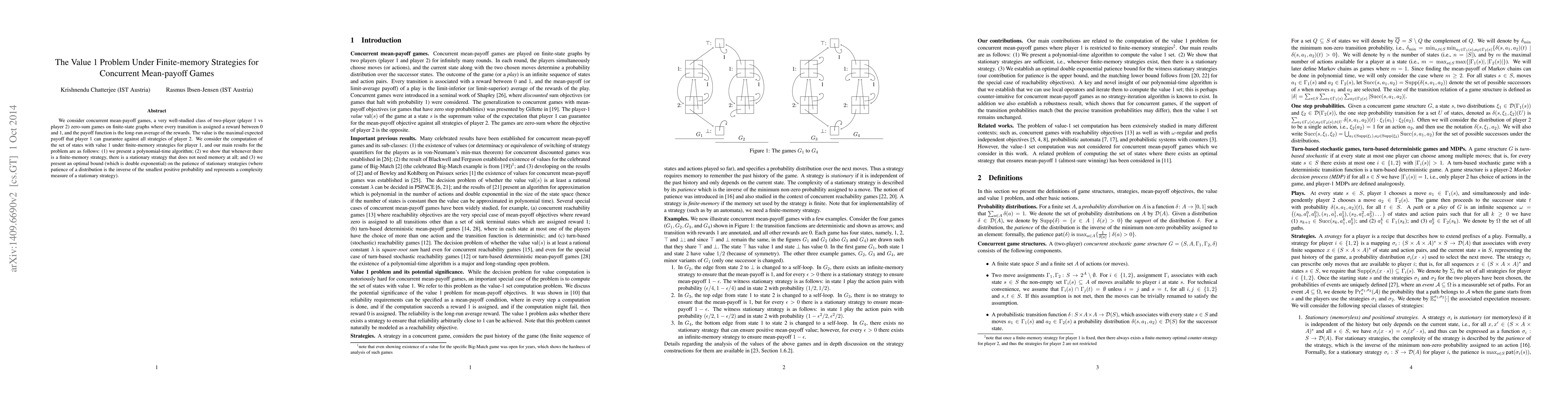 This paper studies concurrent mean-payoff games, focusing on determining states where player 1 can guarantee a maximal payoff of 1 using finite-memory strategies. The authors present a polynomial-time algorithm for this computation and demonstrate that finite-memory strategies can be replaced by simpler stationary strategies.