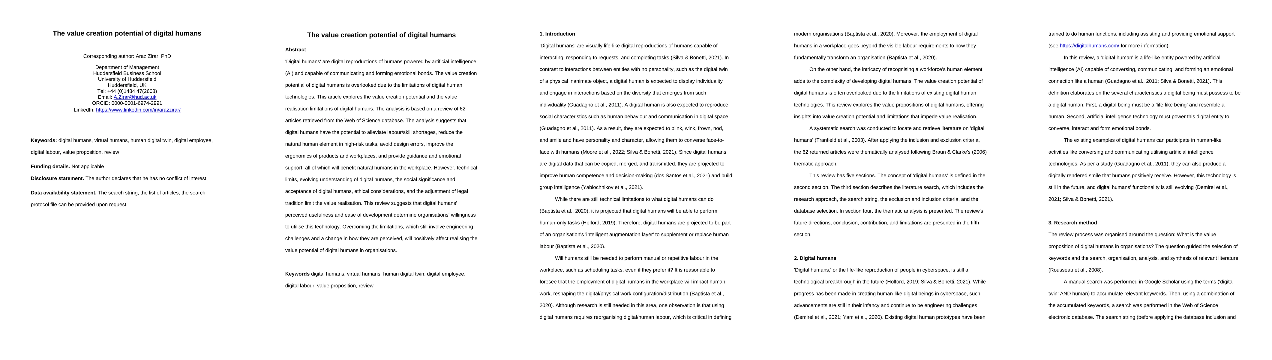 'Digital humans' are digital reproductions of humans powered by artificial intelligence (AI) and capable of communicating and forming emotional bonds. The value creation potential of digital humans is overlooked due to the limitations of digital human technologies. This article explores the value creation potential and the value realisation limitations of digital humans. The analysis is based on a review of 62 articles retrieved from the Web of Science database. The analysis suggests that digital humans have the potential to alleviate labour and skill shortages, reduce the natural human element in high-risk tasks, avoid design errors, improve the ergonomics of products and workplaces, and provide guidance and emotional support, all of which will benefit natural humans in the workplace. However, technical limits, evolving understanding of digital humans, the social significance and acceptance of digital humans, ethical considerations, and the adjustment of legal tradition limit the value realisation. This review suggests that digital humans' perceived usefulness and ease of development determine organisations' willingness to utilise this technology. Overcoming the limitations, which still involve engineering challenges and a change in how they are perceived, will positively affect realising the value potential of digital humans in organisations.