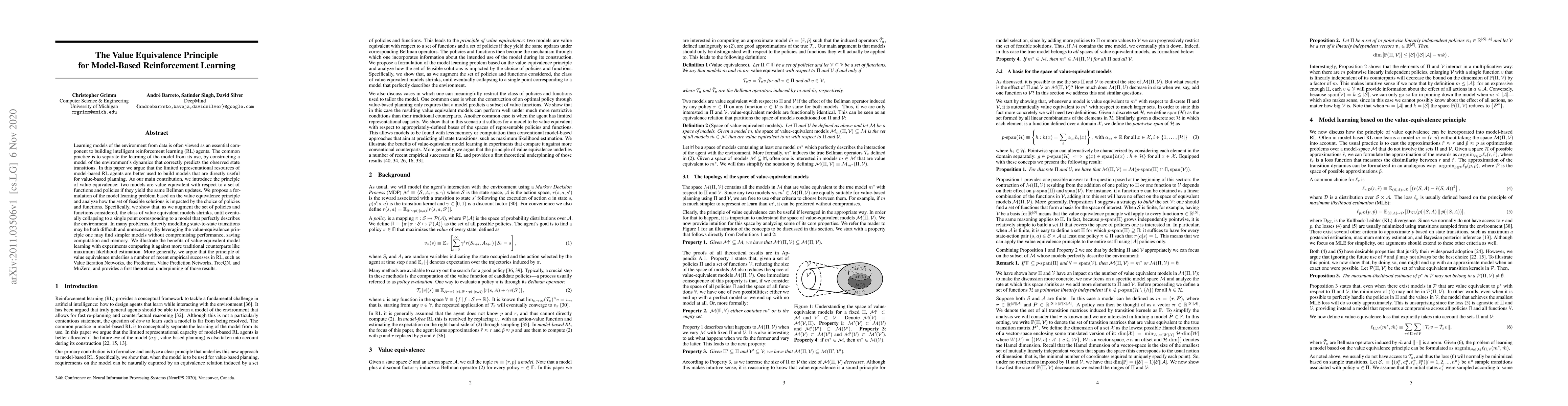 This paper proposes the value equivalence principle for model-based reinforcement learning, suggesting that models should be learned to directly support value-based planning rather than just predicting state transitions. It introduces the concept of value equivalence, where models yielding the same Bellman updates are considered equivalent, and demonstrates how this principle can lead to simpler, more efficient models without sacrificing performance.