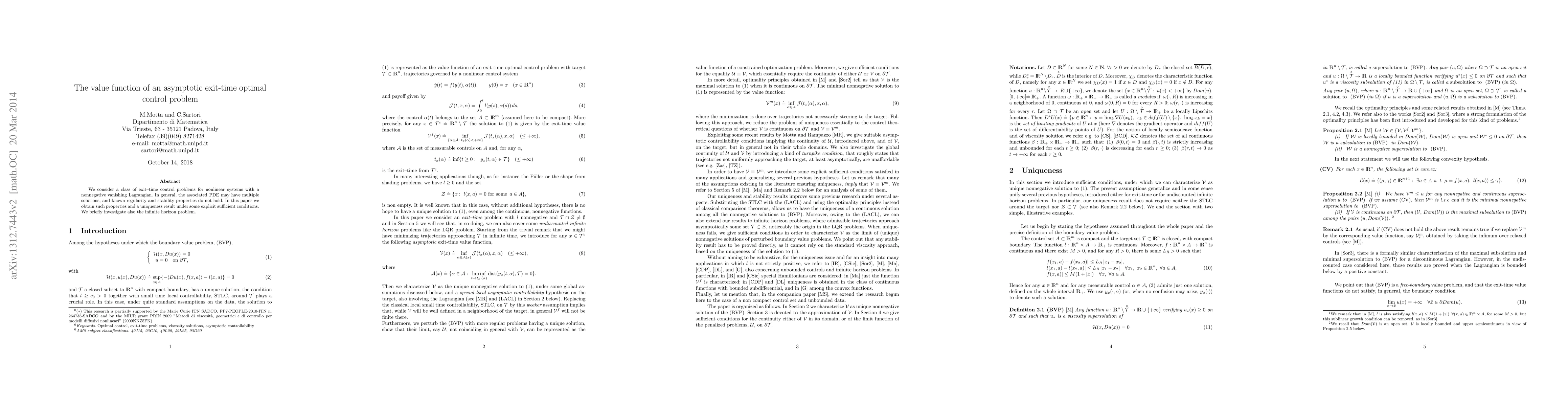 We consider a class of exit--time control problems for nonlinear systems with a nonnegative vanishing Lagrangian. In general, the associated PDE may have multiple solutions, and known regularity and stability properties do not hold. In this paper we obtain such properties and a uniqueness result under some explicit sufficient conditions. We briefly investigate also the infinite horizon problem.