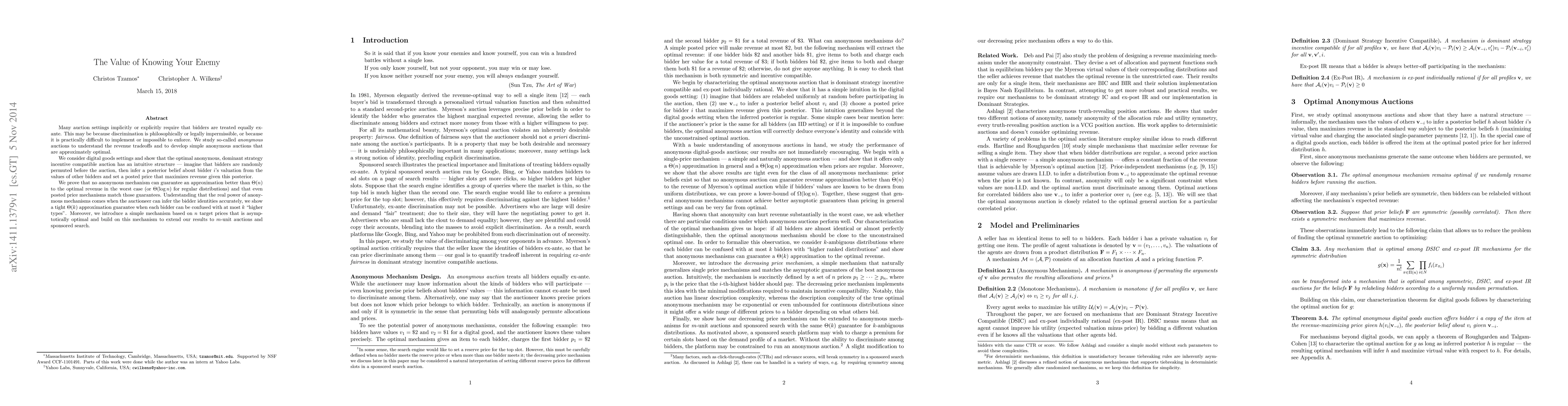 Many auction settings implicitly or explicitly require that bidders are treated equally ex-ante. This may be because discrimination is philosophically or legally impermissible, or because it is practically difficult to implement or impossible to enforce. We study so-called {\em anonymous} auctions to understand the revenue tradeoffs and to develop simple anonymous auctions that are approximately optimal. We consider digital goods settings and show that the optimal anonymous, dominant strategy incentive compatible auction has an intuitive structure --- imagine that bidders are randomly permuted before the auction, then infer a posterior belief about bidder i's valuation from the values of other bidders and set a posted price that maximizes revenue given this posterior. We prove that no anonymous mechanism can guarantee an approximation better than O(n) to the optimal revenue in the worst case (or O(log n) for regular distributions) and that even posted price mechanisms match those guarantees. Understanding that the real power of anonymous mechanisms comes when the auctioneer can infer the bidder identities accurately, we show a tight O(k) approximation guarantee when each bidder can be confused with at most k "higher types". Moreover, we introduce a simple mechanism based on n target prices that is asymptotically optimal and build on this mechanism to extend our results to m-unit auctions and sponsored search.