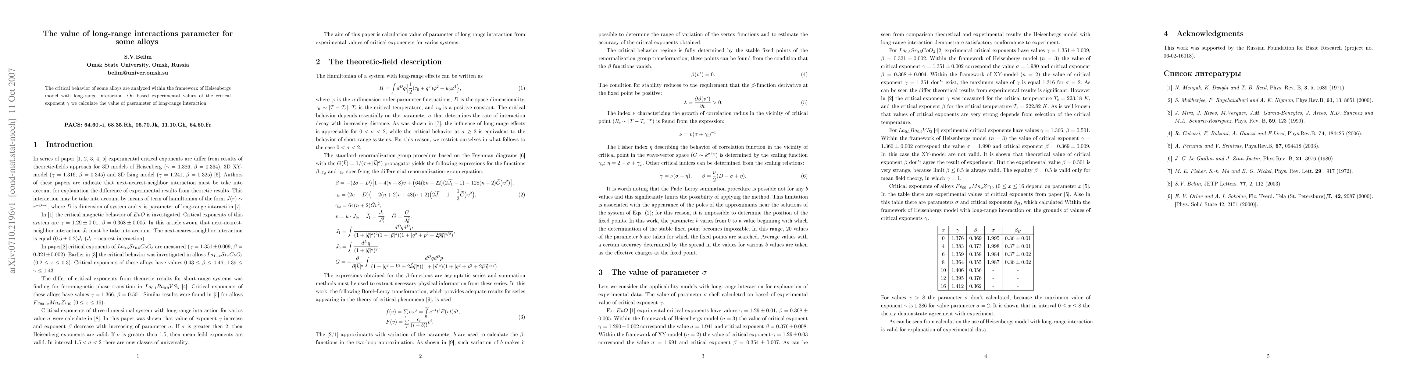 The critical behavior of some alloys are analyzed within the framework of Heisenbergs model with long-range interaction. On based experimental values of the critical exponent $\gamma$ we calculate the value of paerameter of long-range interaction.