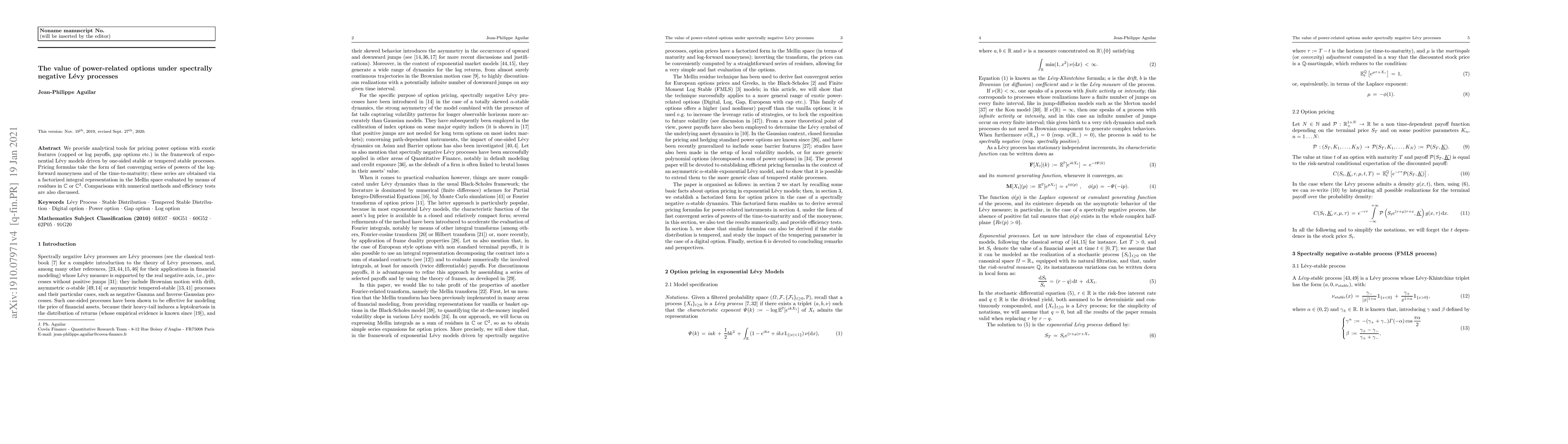 This paper develops analytical pricing formulas for power options under spectrally negative Lévy processes, using a factorized integral representation in Mellin space. The formulas are efficient and compared with numerical methods for validation.