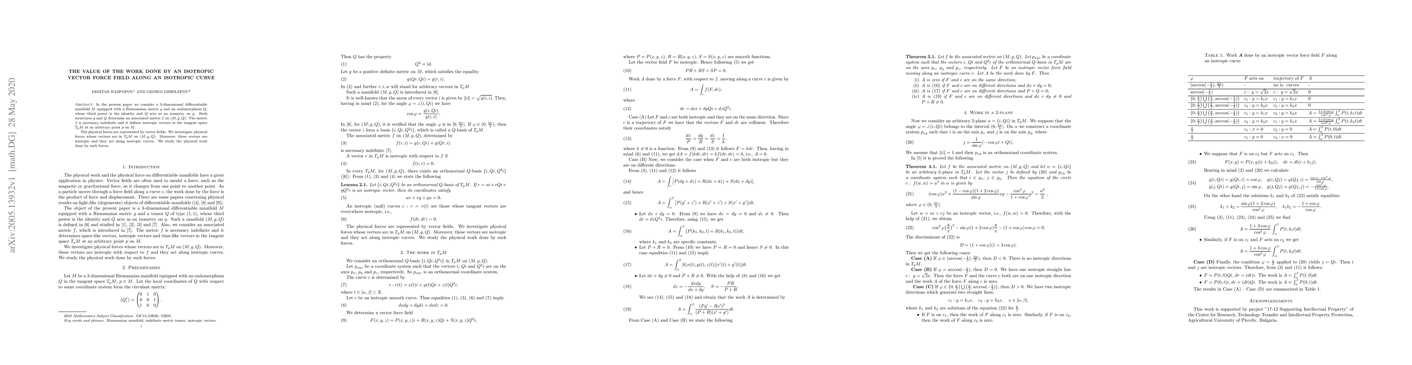 In the present paper we consider a 3-dimensional differentiable manifold $M$ equipped with a Riemannian metric $g$ and an endomorphism $Q$, whose third power is the identity and $Q$ acts as an isometry on $g$. Both structures $g$ and $Q$ determine an associated metric $f$ on $(M, g, Q)$. The metric $f$ is necessary indefinite and it defines isotropic vectors in the tangent space $T_{p}M$ at an arbitrary point $p$ on $M$. The physical forces are represented by vector fields. We investigate physical forces whose vectors are in $T_{p}M$ on $(M, g, Q)$. Moreover, these vectors are isotropic and they act along isotropic curves. We study the physical work done by such forces.