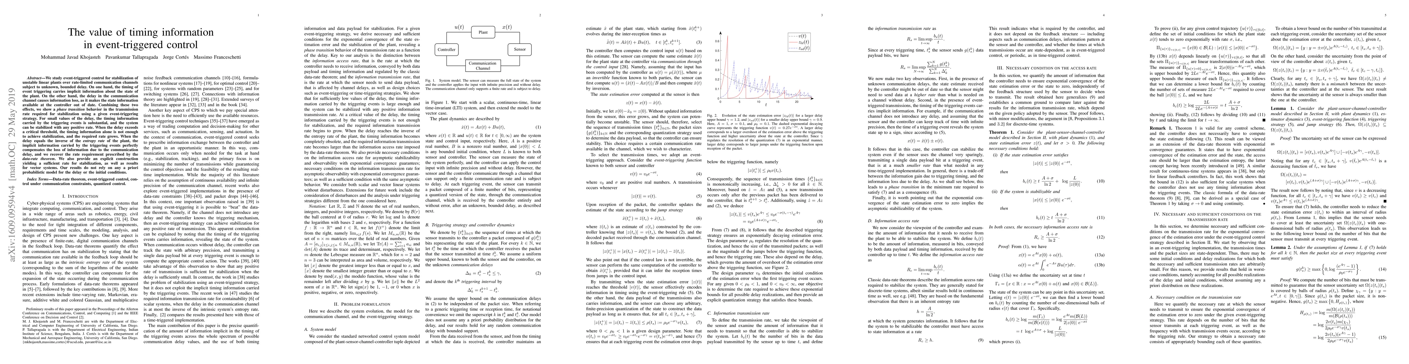 We study event-triggered control for stabilization of unstable linear plants over rate-limited communication channels subject to unknown, bounded delay. On one hand, the timing of event triggering carries implicit information about the state of the plant. On the other hand, the delay in the communication channel causes information loss, as it makes the state information available at the controller out of date. Combining these two effects, we show a phase transition behavior in the transmission rate required for stabilization using a given event-triggering strategy. For small values of the delay, the timing information carried by the triggering events is substantial, and the system can be stabilized with any positive rate. When the delay exceeds a critical threshold, the timing information alone is not enough to achieve stabilization and the required rate grows. When the loss of information due to the communication delay perfectly compensates the implicit information carried by the triggering events, the delay equals the inverse of the entropy rate of the plant, and we obtain the same rate requirement prescribed by the data-rate theorem. When the delay is larger than this threshold, the required rate becomes larger than that required by the data-rate theorem. We also provide an explicit construction yielding a sufficient rate for stabilization, and generalize our results to vector systems. The results do not rely on any a priori probabilistic model of the delay or the initial conditions.