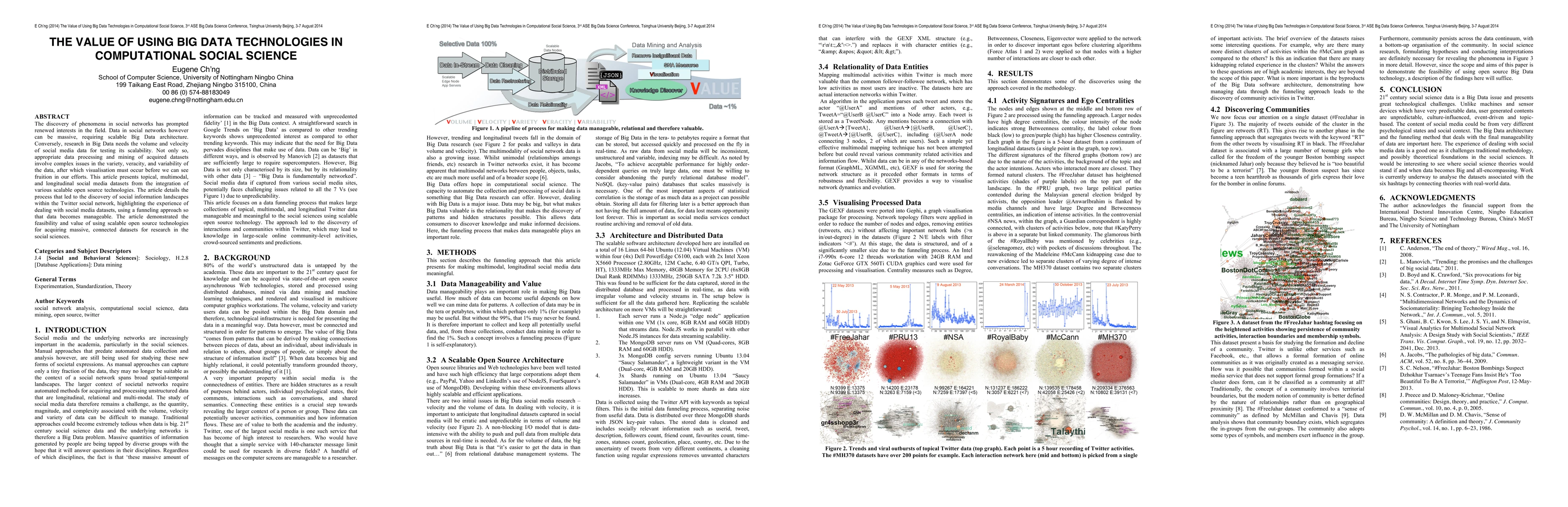 The discovery of phenomena in social networks has prompted renewed interests in the field. Data in social networks however can be massive, requiring scalable Big Data architecture. Conversely, research in Big Data needs the volume and velocity of social media data for testing its scalability. Not only so, appropriate data processing and mining of acquired datasets involve complex issues in the variety, veracity, and variability of the data, after which visualisation must occur before we can see fruition in our efforts. This article presents topical, multimodal, and longitudinal social media datasets from the integration of various scalable open source technologies. The article details the process that led to the discovery of social information landscapes within the Twitter social network, highlighting the experience of dealing with social media datasets, using a funneling approach so that data becomes manageable. The article demonstrated the feasibility and value of using scalable open source technologies for acquiring massive, connected datasets for research in the social sciences.