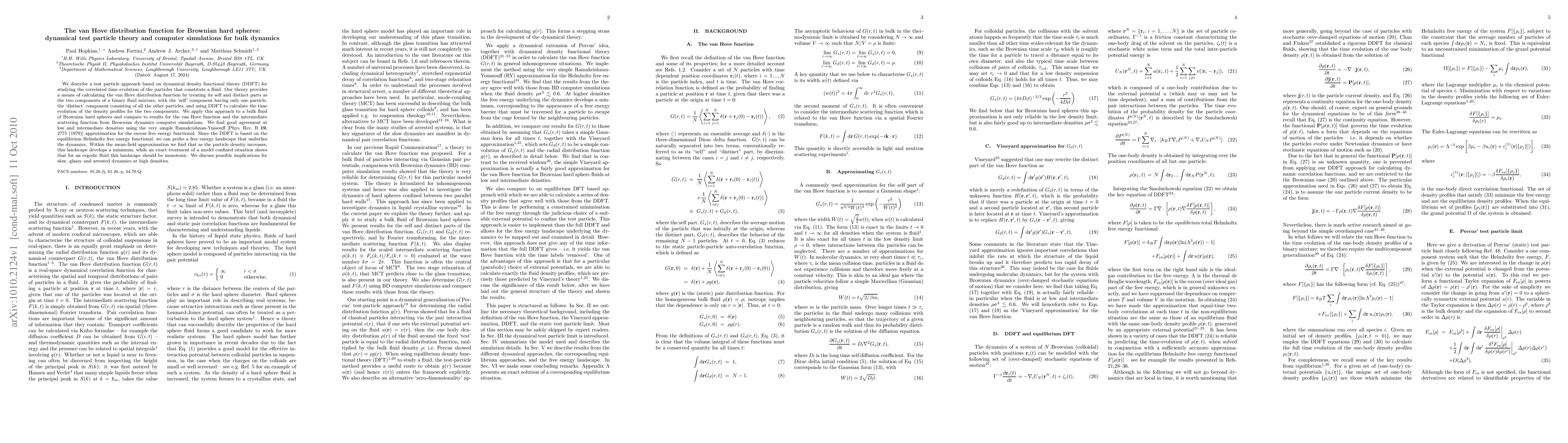 We describe a test particle approach based on dynamical density functional theory (DDFT) for studying the correlated time evolution of the particles that constitute a fluid. Our theory provides a means of calculating the van Hove distribution function by treating its self and distinct parts as the two components of a binary fluid mixture, with the `self' component having only one particle, the `distinct' component consisting of all the other particles, and using DDFT to calculate the time evolution of the density profiles for the two components. We apply this approach to a bulk fluid of Brownian hard spheres and compare to results for the van Hove function and the intermediate scattering function from Brownian dynamics computer simulations. We find good agreement at low and intermediate densities using the very simple Ramakrishnan-Yussouff [Phys. Rev. B 19, 2775 (1979)] approximation for the excess free energy functional. Since the DDFT is based on the equilibrium Helmholtz free energy functional, we can probe a free energy landscape that underlies the dynamics. Within the mean-field approximation we find that as the particle density increases, this landscape develops a minimum, while an exact treatment of a model confined situation shows that for an ergodic fluid this landscape should be monotonic. We discuss possible implications for slow, glassy and arrested dynamics at high densities.