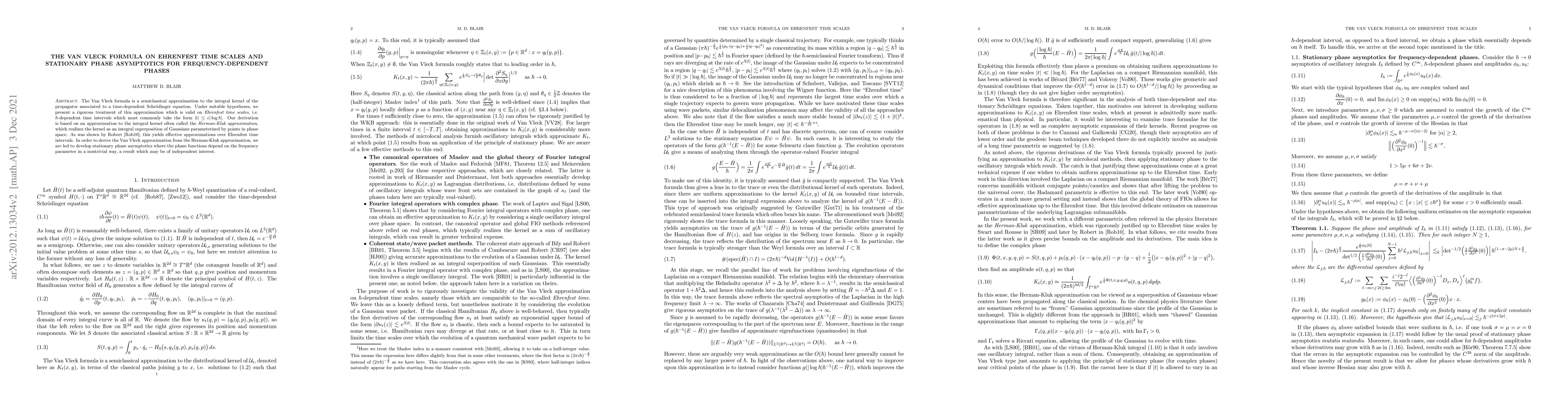 The Van Vleck formula is a semiclassical approximation to the integral kernel of the propagator associated to a time-dependent Schr\"odinger equation. Under suitable hypotheses, we present a rigorous treatment of this approximation which is valid on "Ehrenfest time scales", i.e. $\hbar$-dependent time intervals which most commonly take the form $|t| \leq c|\log\hbar|$. Our derivation is based on an approximation to the integral kernel often called the "Herman-Kluk approximation", which realizes the kernel as an integral superposition of Gaussians parameterized by points in phase space. As was shown by Robert, this yields effective approximations over Ehrenfest time intervals. In order to derive the Van Vleck approximation from the Herman-Kluk approximation, we are led to develop stationary phase asymptotics where the phase functions depend on the frequency parameter in a nontrivial way, a result which may be of independent interest.