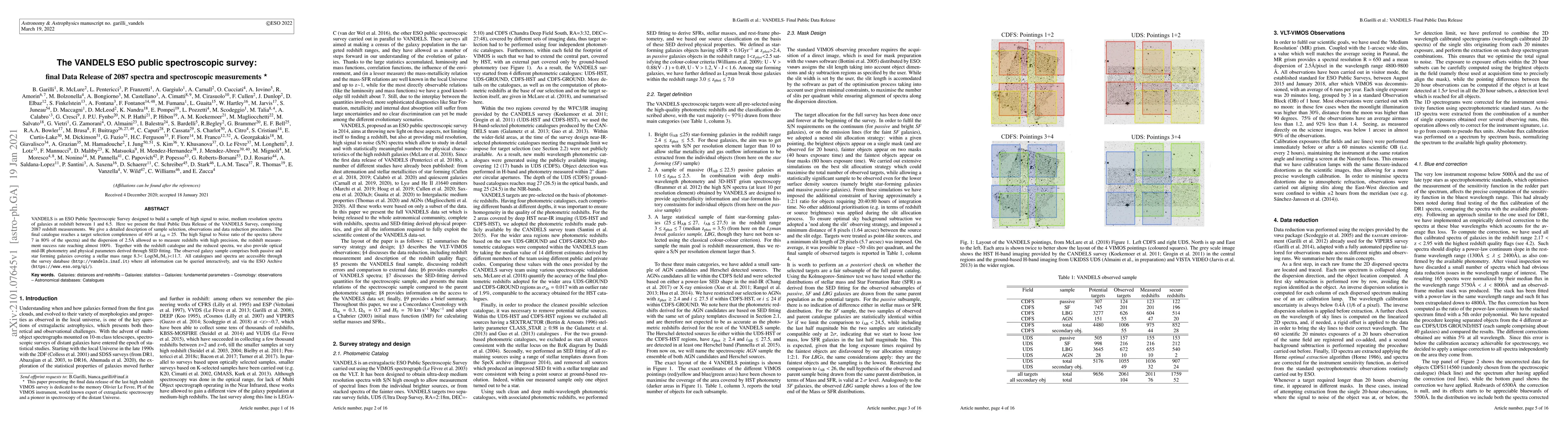 VANDELS, an ESO Public Spectroscopic Survey, has released its final dataset of 2087 high-precision redshift measurements for galaxies at redshifts 1-6.5, providing detailed sample selection and data reduction procedures, and accessible through the VANDELS database and ESO Archive.