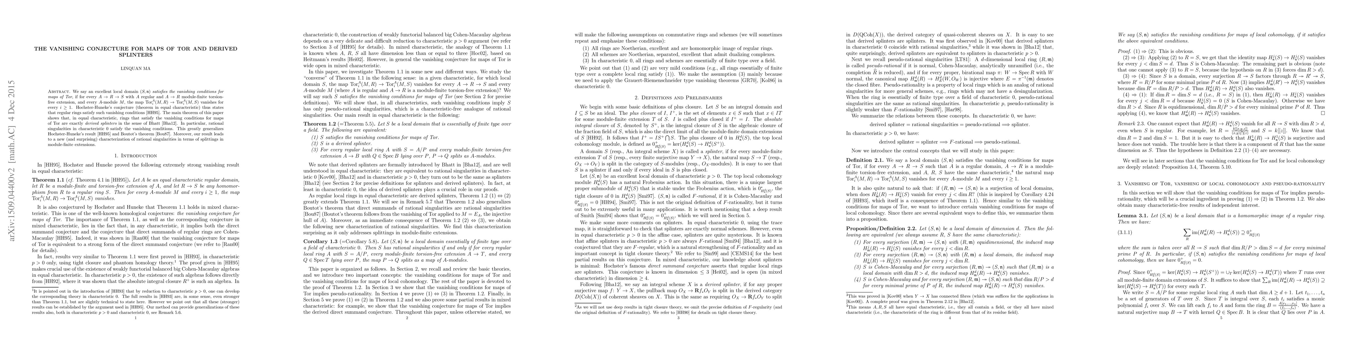 The work introduces a new perspective by linking the vanishing conditions for maps of Tor with the theory of derived splinters, offering a more comprehensive understanding and extending known results in commutative algebra.