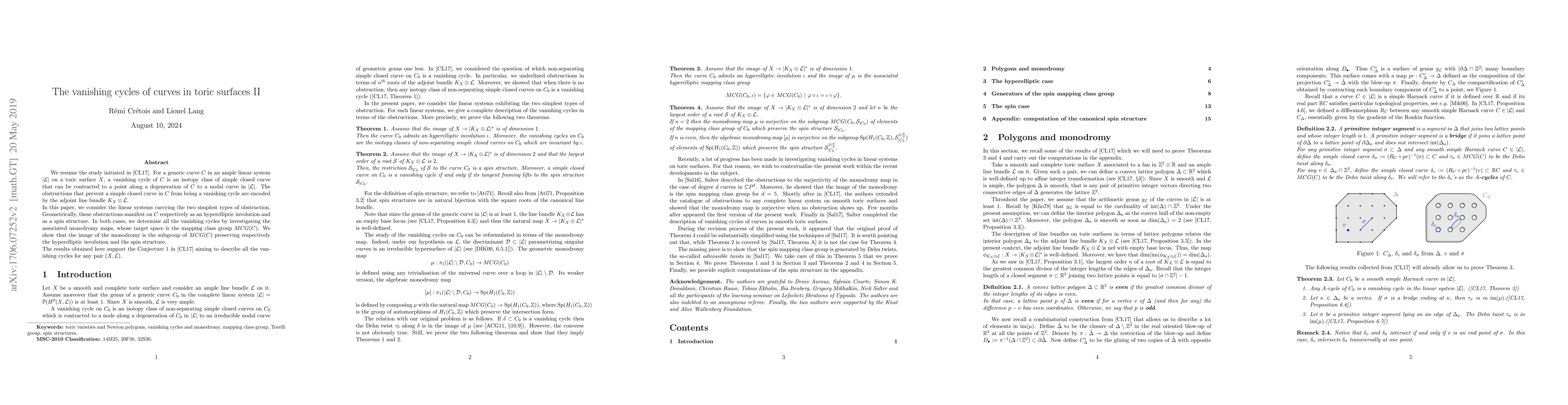 We resume the study initiated in \cite{CL}. For a generic curve $C$ in an ample linear system $\vert \mathcal{L} \vert$ on a toric surface $X$, a vanishing cycle of $C$ is an isotopy class of simple closed curve that can be contracted to a point along a degeneration of $C$ to a nodal curve in $\vert \mathcal{L} \vert$. The obstructions that prevent a simple closed curve in $C$ from being a vanishing cycle are encoded by the adjoint line bundle $K_X \otimes \mathcal{L}$. In this paper, we consider the linear systems carrying the two simplest types of obstruction. Geometrically, these obstructions manifest on $C$ respectively as an hyperelliptic involution and as a Spin structure. In both cases, we determine all the vanishing cycles by investigating the associated monodromy maps, whose target space is the mapping class group $MCG(C)$. We show that the image of the monodromy is the subgroup of $MCG(C)$ preserving respectively the hyperelliptic involution and the Spin structure. In particular, we provide an explicit finite set of generators for the Spin mapping class group. The results obtained here support the Conjecture $1$ in \cite{CL} aiming to describe all the vanishing cycles for any pair $(X, \mathcal{L})$.