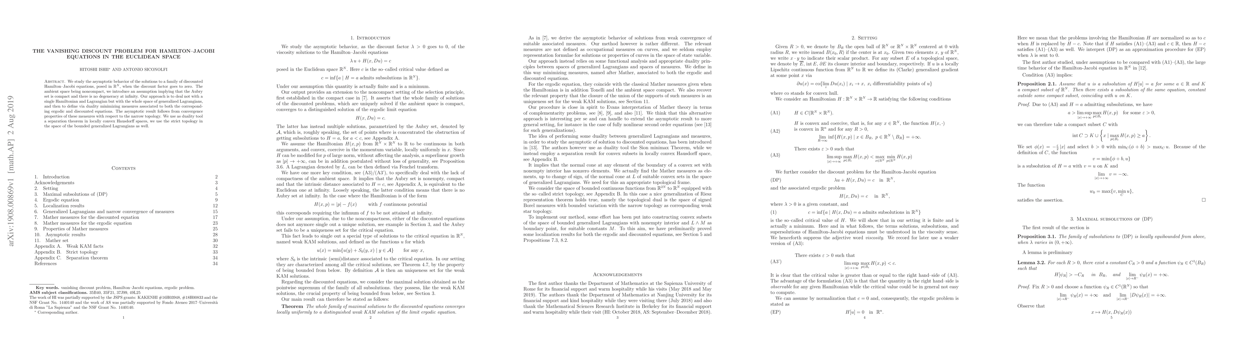 This paper investigates the asymptotic behavior of solutions to discounted Hamilton-Jacobi equations in Euclidean space as the discount factor approaches zero. It employs a generalized Lagrangian approach and uses duality and minimizing measures to derive the result, leveraging convergence properties and a separation theorem in locally convex spaces.