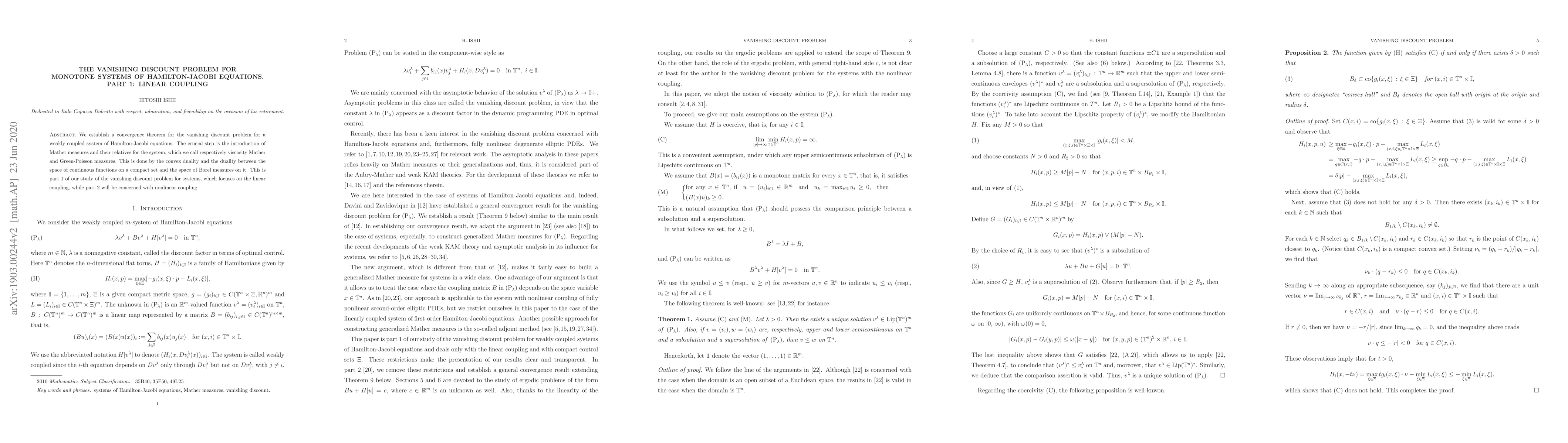 This paper establishes a convergence theorem for the vanishing discount problem in a weakly coupled system of Hamilton-Jacobi equations, introducing new measures—viscosity Mather and Green-Poisson measures—using convex duality. This is the first part focusing on linear coupling, with part 2 addressing nonlinear coupling.
