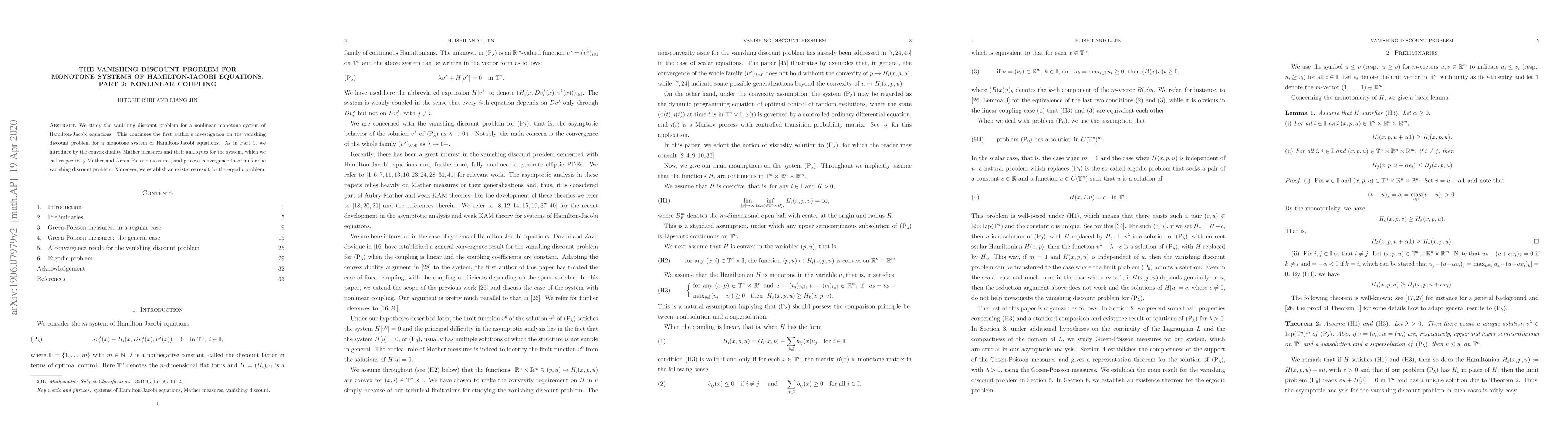 This paper investigates the vanishing discount problem for a nonlinear monotone system of Hamilton-Jacobi equations, extending previous work. The authors introduce Mather and Green-Poisson measures via convex duality and prove a convergence theorem for the vanishing discount problem, along with an existence result for the ergodic problem.