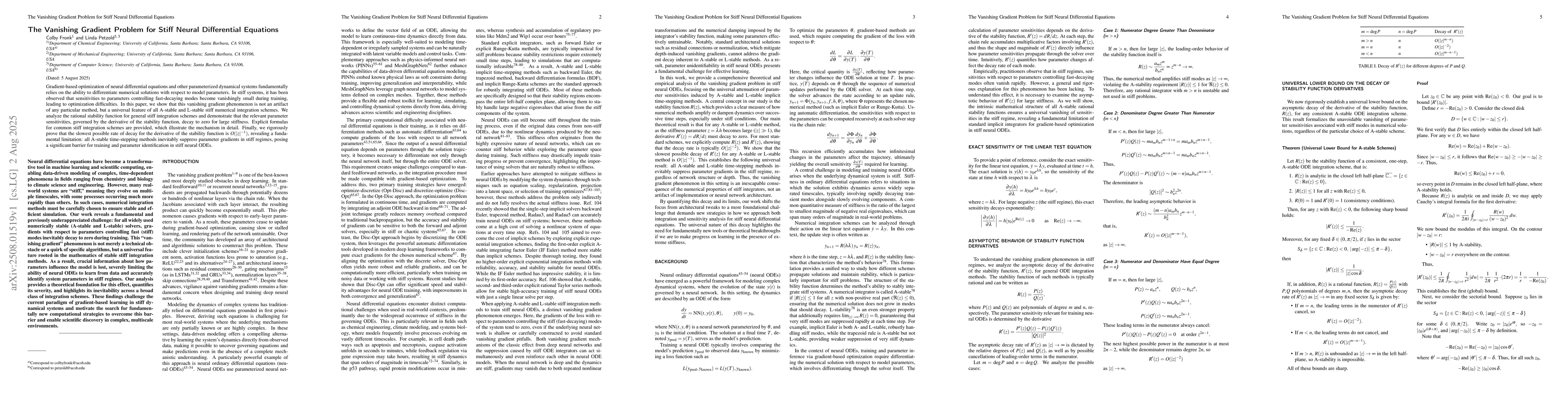The research establishes a fundamental limitation in training stiff neural ODEs, distinct from the classical vanishing gradient problem, by linking it to the mathematical properties required for numerical stability in stiff integration schemes.
