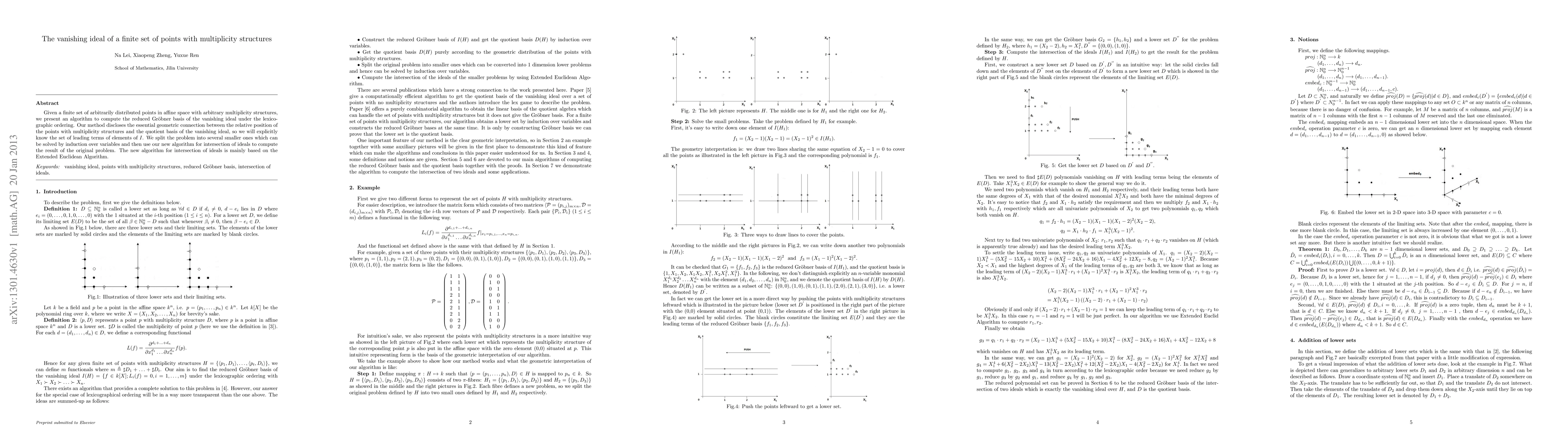 Given a finite set of arbitrarily distributed points in affine space with arbitrary multiplicity structures, we present an algorithm to compute the reduced Groebner basis of the vanishing ideal under the lexicographic ordering. Our method discloses the essential geometric connection between the relative position of the points with multiplicity structures and the quotient basis of the vanishing ideal, so we will explicitly know the set of leading terms of elements of I. We split the problem into several smaller ones which can be solved by induction over variables and then use our new algorithm for intersection of ideals to compute the result of the original problem. The new algorithm for intersection of ideals is mainly based on the Extended Euclidean Algorithm.