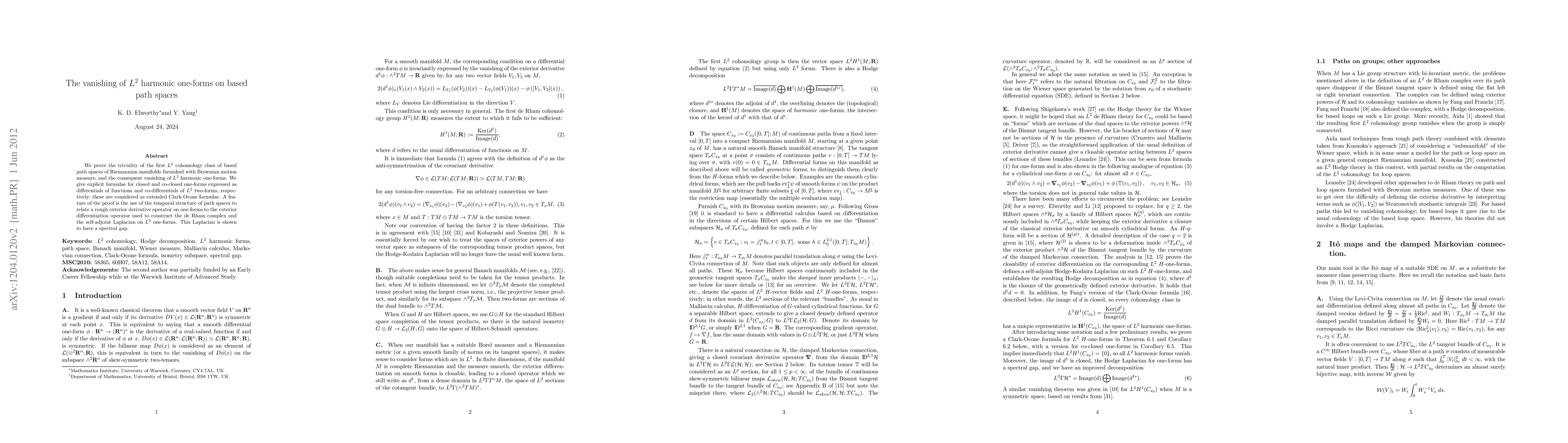 This paper demonstrates the triviality of the first L2 cohomology class for based path spaces of Riemannian manifolds with Brownian motion measure, leading to the vanishing of L2 harmonic one-forms. It also provides explicit expressions for closed and co-closed one-forms, and leverages the temporal structure of path spaces to establish a spectral gap for the self-adjoint Laplacian on L2 one-forms.
