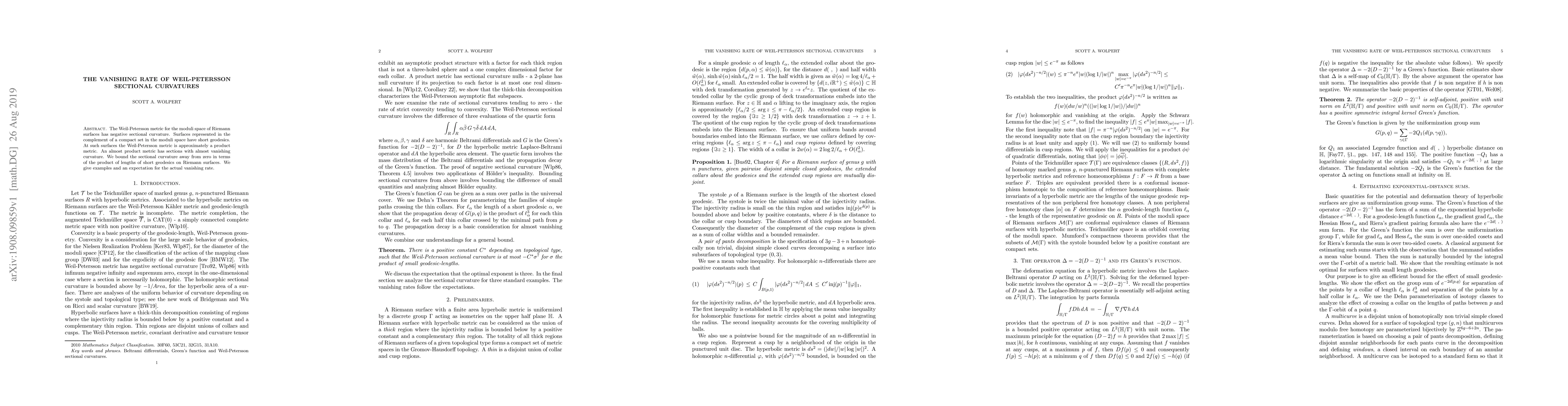 The Weil-Petersson metric for the moduli space of Riemann surfaces has negative sectional curvature. Surfaces represented in the complement of a compact set in the moduli space have short geodesics. At such surfaces the Weil-Petersson metric is approximately a product metric. An almost product metric has sections with almost vanishing curvature. We bound the sectional curvature away from zero in terms of the product of lengths of short geodesics on Riemann surfaces. We give examples and an expectation for the actual vanishing rate.