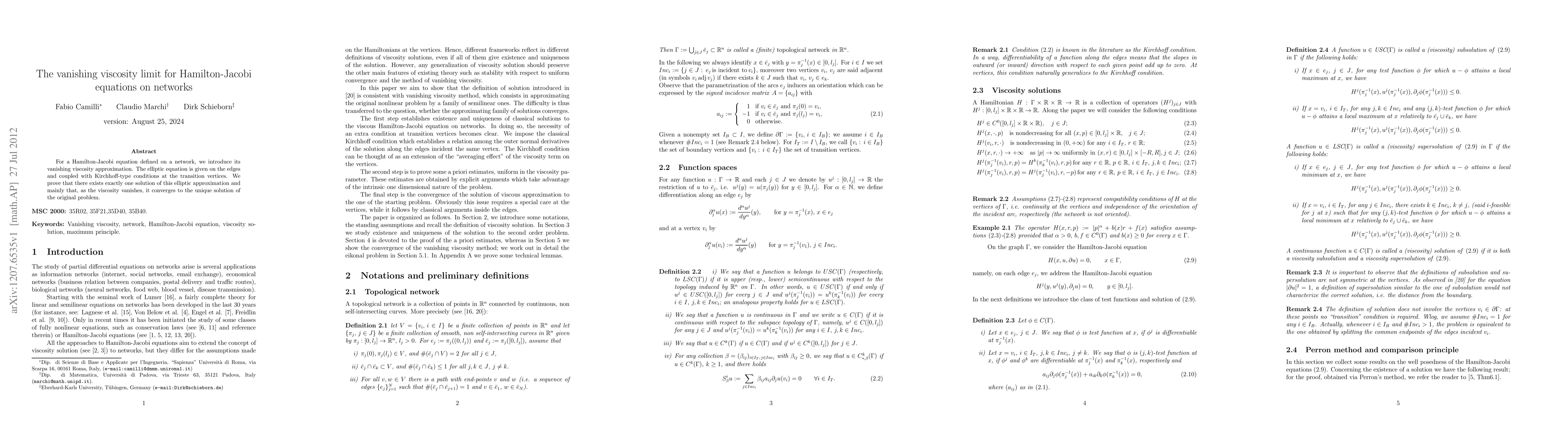 This paper investigates the vanishing viscosity approximation for Hamilton-Jacobi equations on networks, proving the existence and uniqueness of a solution to the elliptic approximation. It demonstrates that as viscosity approaches zero, the solution converges to the solution of the original Hamilton-Jacobi equation.