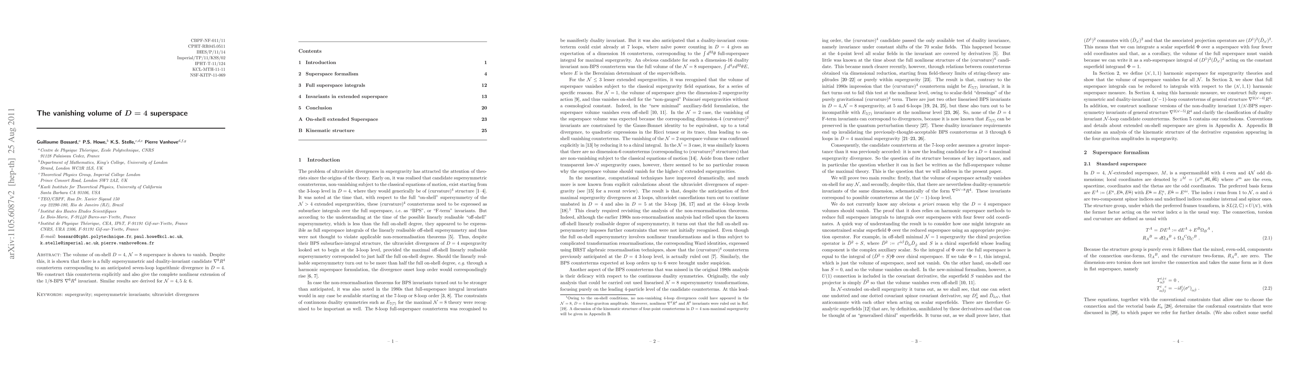 The volume of on-shell D=4, N=8 superspace is shown to vanish. Despite this, it is shown that there is a fully supersymmetric and duality-invariant candidate d^8 R^4 counterterm corresponding to an anticipated seven-loop logarithmic divergence in D=4. We construct this counterterm explicitly and also give the complete nonlinear extension of the 1/8-BPS d^6 R^4 invariant. Similar results are derived for N=4,5 & 6.