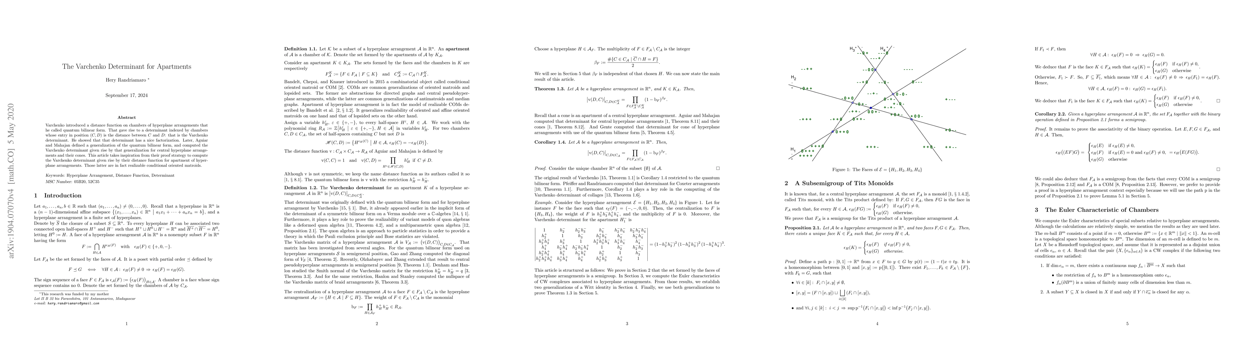 This paper computes the Varchenko determinant for apartments of hyperplane arrangements using a proof strategy inspired by Aguiar and Mahajan’s work on a generalized quantum bilinear form. It shows how this determinant arises from the distance function for central hyperplane arrangements and their cones, aligning with realizable conditional oriented matroids.