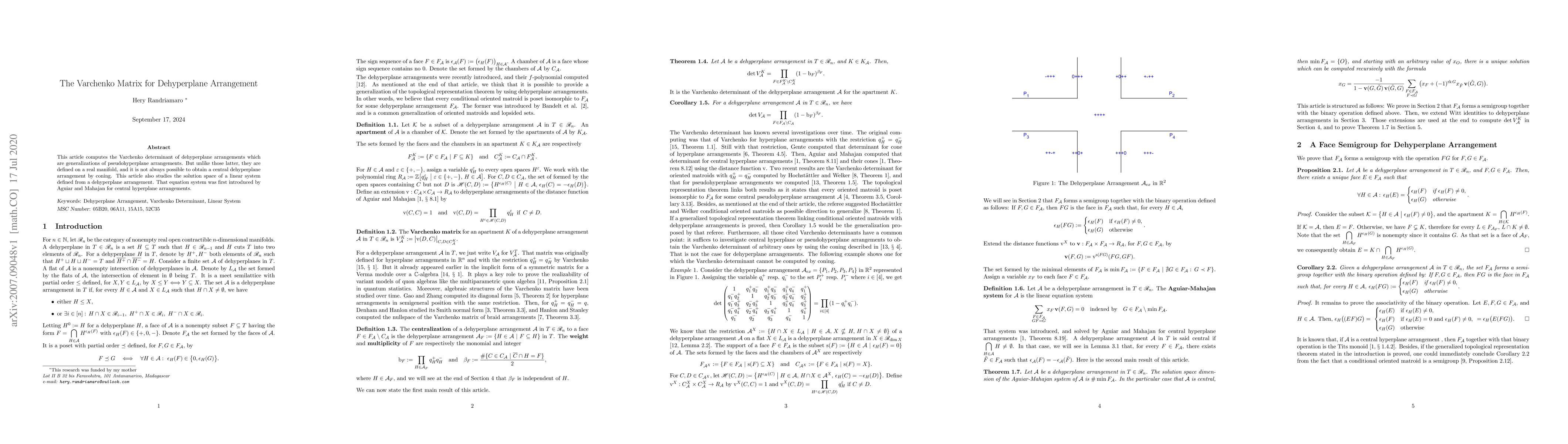 This article computes the Varchenko determinant of dehyperplane arrangements which are generalizations of pseudohyperplane arrangements. But unlike those latter, they are defined on a real manifold, and it is not always possible to obtain a central dehyperplane arrangement by coning. This article also studies the solution space of a linear system defined from a dehyperplane arrangement. That equation system was first introduced by Aguiar and Mahajan for central hyperplane arrangements.