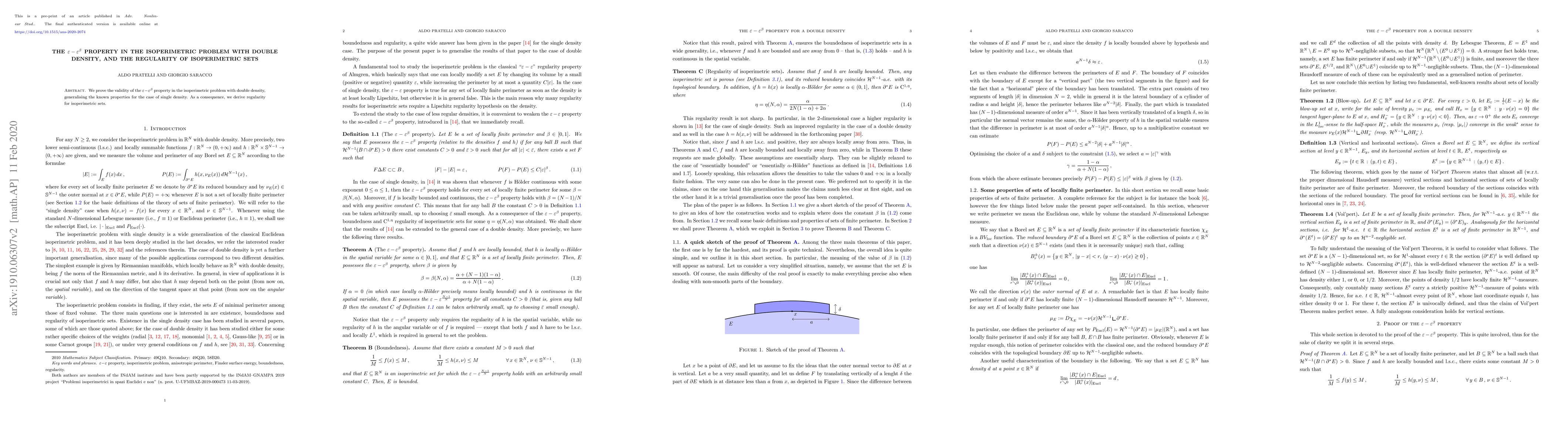 Summary: The paper proves the $\varepsilon-\varepsilon^\beta$ property for the isoperimetric problem with double density, extending known single-density properties, and demonstrates the regularity of isoperimetric sets as a result.
