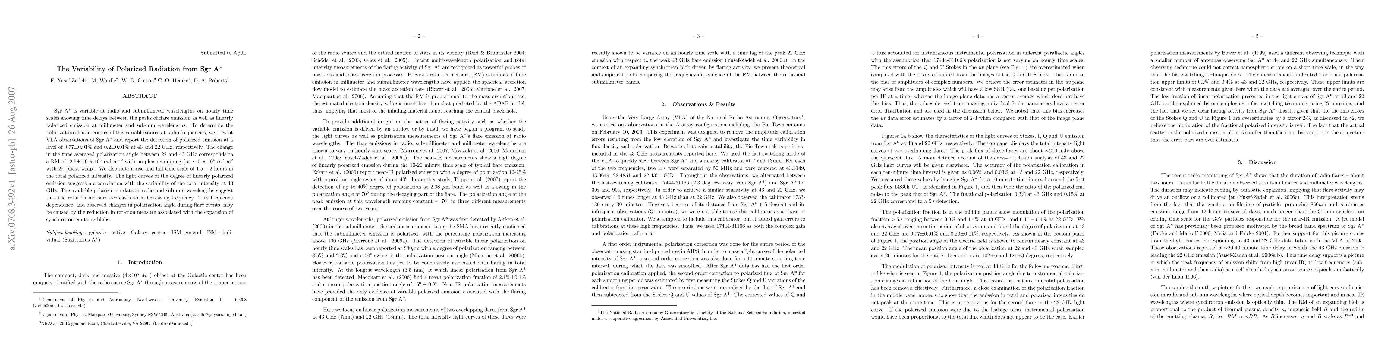 Sgr A* is variable at radio and submillimeter wavelengths on hourly time scales showing time delays between the peaks of flare emission as well as linearly polarized emission at millimeter and sub-mm wavelengths. To determine the polarization characteristics of this variable source at radio frequencies, we present VLA observations of Sgr A* and report the detection of polarized emission at a level of 0.77\pm0.01% and 0.2\pm0.01% at 43 and 22 GHz, respectively. The change in the time averaged polarization angle between 22 and 43 GHz corresponds to a RM of -2.5\pm0.6 x10^3 rad m{-2} with no phase wrapping (or \sim 5x10^4 rad m^2 with 2\pi phase wrap). We also note a rise and fall time scale of 1.5 -- 2 hours in the total polarized intensity. The light curves of the degree of linearly polarized emission suggests a a correlation with the variability of the total intensity at 43 GHz. The available polarization data at radio and sub-mm wavelengths suggest that the rotation measure decreases with decreasing frequency. This frequency dependence, and observed changes in polarization angle during flare events, may be caused by the reduction in rotation measure associated with the expansion of synchrotron-emitting blobs.