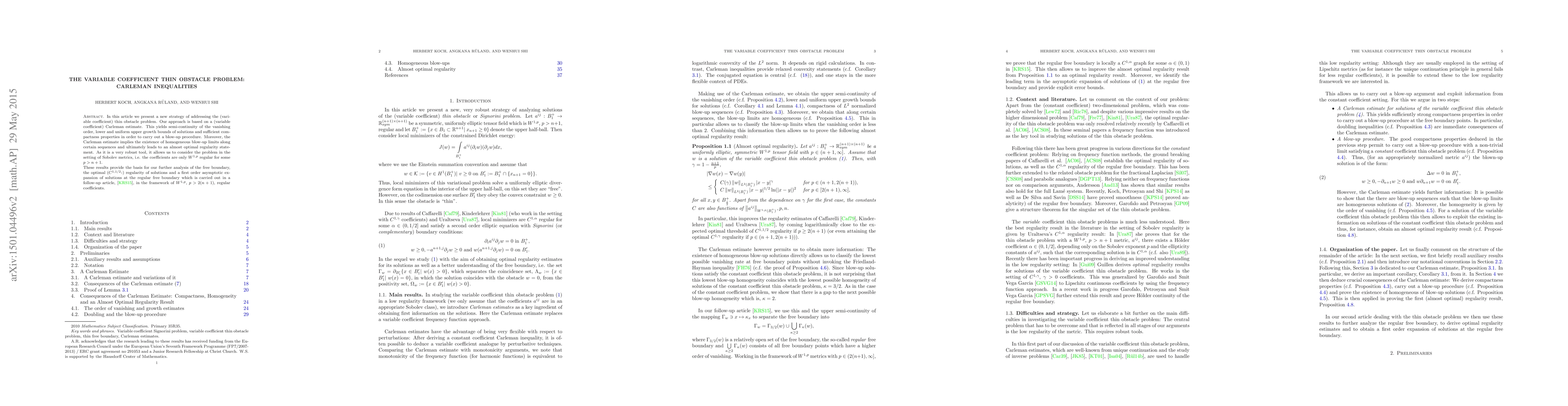 This paper introduces a novel method for solving the variable coefficient thin obstacle problem using a variable coefficient Carleman estimate, which provides semi-continuity and growth bounds for solutions, and leads to almost optimal regularity results. The approach is robust enough to handle coefficients in Sobolev metrics.