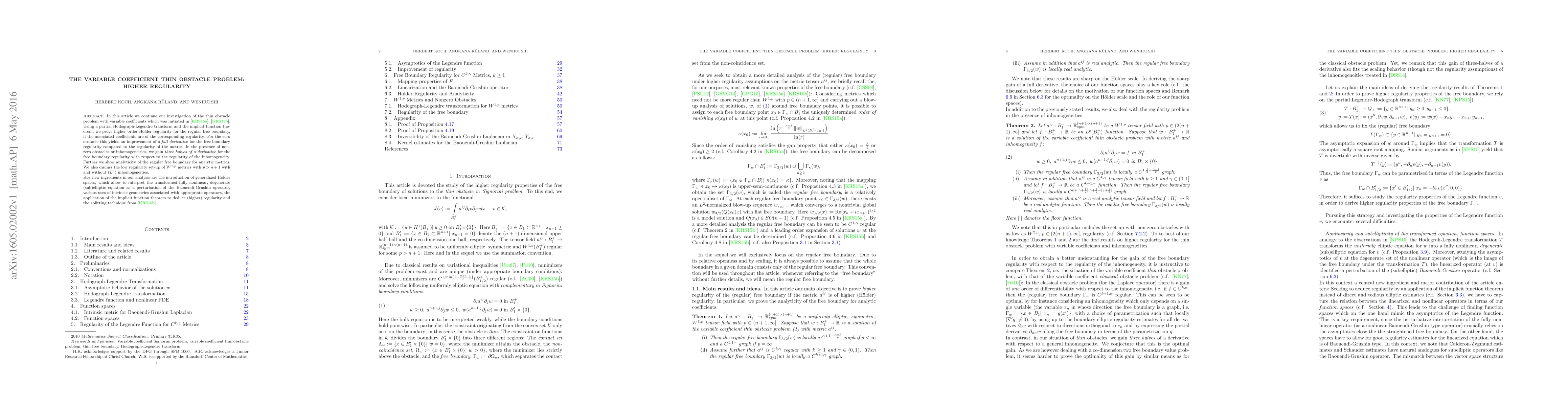 In this article we continue our investigation of the thin obstacle problem with variable coefficients which was initiated in \cite{KRS14}, \cite{KRSI}. Using a partial Hodograph-Legendre transform and the implicit function theorem, we prove higher order H\"older regularity for the regular free boundary, if the associated coefficients are of the corresponding regularity. For the zero obstacle this yields an improvement of a \emph{full derivative} for the free boundary regularity compared to the regularity of the metric. In the presence of non-zero obstacles or inhomogeneities, we gain \emph{three halves of a derivative} for the free boundary regularity with respect to the regularity of the inhomogeneity. Further we show analyticity of the regular free boundary for analytic metrics. We also discuss the low regularity set-up of $W^{1,p}$ metrics with $p>n+1$ with and without ($L^p$) inhomogeneities. Key new ingredients in our analysis are the introduction of generalized H\"older spaces, which allow to interpret the transformed fully nonlinear, degenerate (sub)elliptic equation as a perturbation of the Baouendi-Grushin operator, various uses of intrinsic geometries associated with appropriate operators, the application of the implicit function theorem to deduce (higher) regularity and the splitting technique from \cite{KRSI}.