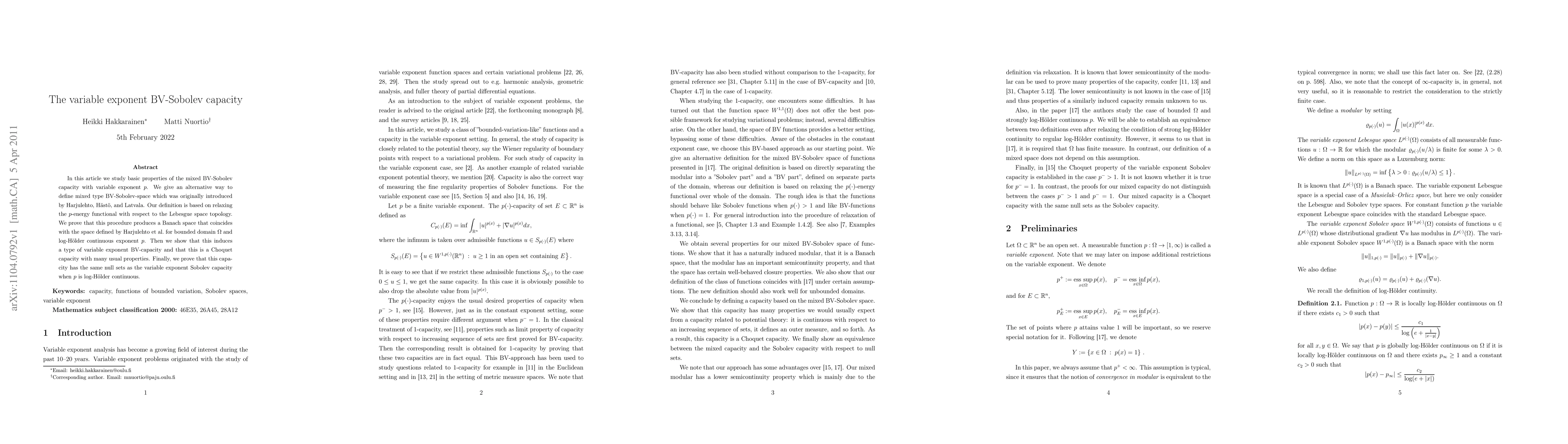 In this article we study basic properties of the mixed BV-Sobolev capacity with variable exponent p. We give an alternative way to define mixed type BV-Sobolev-space which was originally introduced by Harjulehto, H\"ast\"o, and Latvala. Our definition is based on relaxing the p-energy functional with respect to the Lebesgue space topology. We prove that this procedure produces a Banach space that coincides with the space defined by Harjulehto et al. for bounded domain and log-H\"older continuous exponent p. Then we show that this induces a type of variable exponent BV-capacity and that this is a Choquet capacity with many usual properties. Finally, we prove that this capacity has the same null sets as the variable exponent Sobolev capacity when p is log-H\"older continuous.