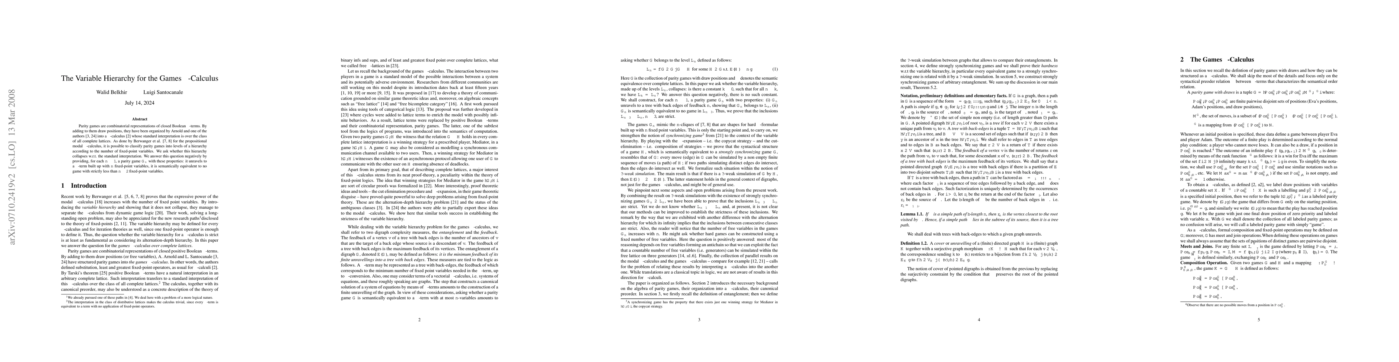 Parity games are combinatorial representations of closed Boolean mu-terms. By adding to them draw positions, they have been organized by Arnold and one of the authors into a mu-calculus. As done by Berwanger et al. for the propositional modal mu-calculus, it is possible to classify parity games into levels of a hierarchy according to the number of fixed-point variables. We ask whether this hierarchy collapses w.r.t. the standard interpretation of the games mu-calculus into the class of all complete lattices. We answer this question negatively by providing, for each n >= 1, a parity game Gn with these properties: it unravels to a mu-term built up with n fixed-point variables, it is semantically equivalent to no game with strictly less than n-2 fixed-point variables.