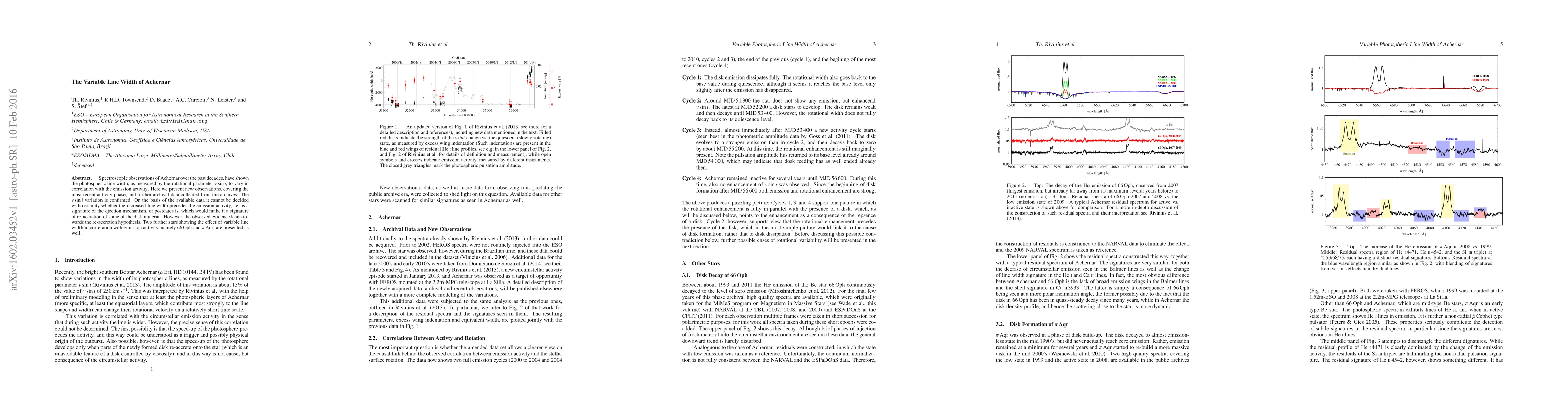 Spectroscopic observations of Achernar over the past decades, have shown the photospheric line width, as measured by the rotational parameter $v \sin i$, to vary in correlation with the emission activity. Here we present new observations, covering the most recent activity phase, and further archival data collected from the archives. The $v \sin i$ variation is confirmed. On the basis of the available data it cannot be decided with certainty whether the increased line width precedes the emission activity, i.e. is a signature of the ejection mechanism, or postdates is, which would make it a signature of re-accretion of some of the disk-material. However, the observed evidence leans towards the re-accretion hypothesis. Two further stars showing the effect of variable line width in correlation with emission activity, namely 66 Oph and $\pi$ Aqr, are presented as well.