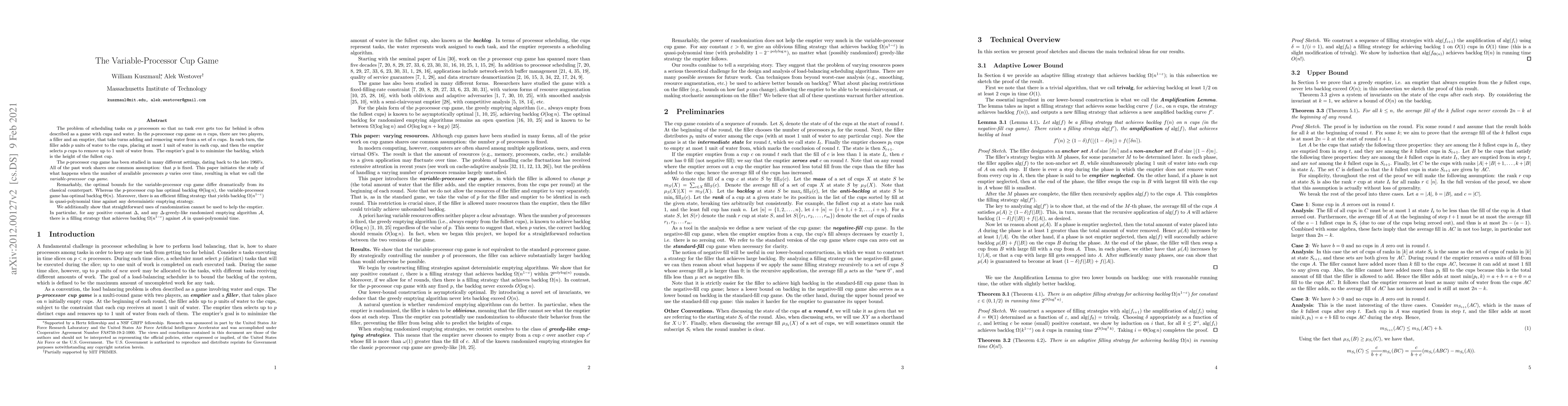The problem of scheduling tasks on $p$ processors so that no task ever gets too far behind is often described as a game with cups and water. In the $p$-processor cup game on $n$ cups, there are two players, a filler and an emptier, that take turns adding and removing water from a set of $n$ cups. In each turn, the filler adds $p$ units of water to the cups, placing at most $1$ unit of water in each cup, and then the emptier selects $p$ cups to remove up to $1$ unit of water from. The emptier's goal is to minimize the backlog, which is the height of the fullest cup. The $p$-processor cup game has been studied in many different settings, dating back to the late 1960's. All of the past work shares one common assumption: that $p$ is fixed. This paper initiates the study of what happens when the number of available processors $p$ varies over time, resulting in what we call the \emph{variable-processor cup game}. Remarkably, the optimal bounds for the variable-processor cup game differ dramatically from its classical counterpart. Whereas the $p$-processor cup has optimal backlog $\Theta(\log n)$, the variable-processor game has optimal backlog $\Theta(n)$. Moreover, there is an efficient filling strategy that yields backlog $\Omega(n^{1 - \epsilon})$ in quasi-polynomial time against any deterministic emptying strategy. We additionally show that straightforward uses of randomization cannot be used to help the emptier. In particular, for any positive constant $\Delta$, and any $\Delta$-greedy-like randomized emptying algorithm $\mathcal{A}$, there is a filling strategy that achieves backlog $\Omega(n^{1 - \epsilon})$ against $\mathcal{A}$ in quasi-polynomial time.