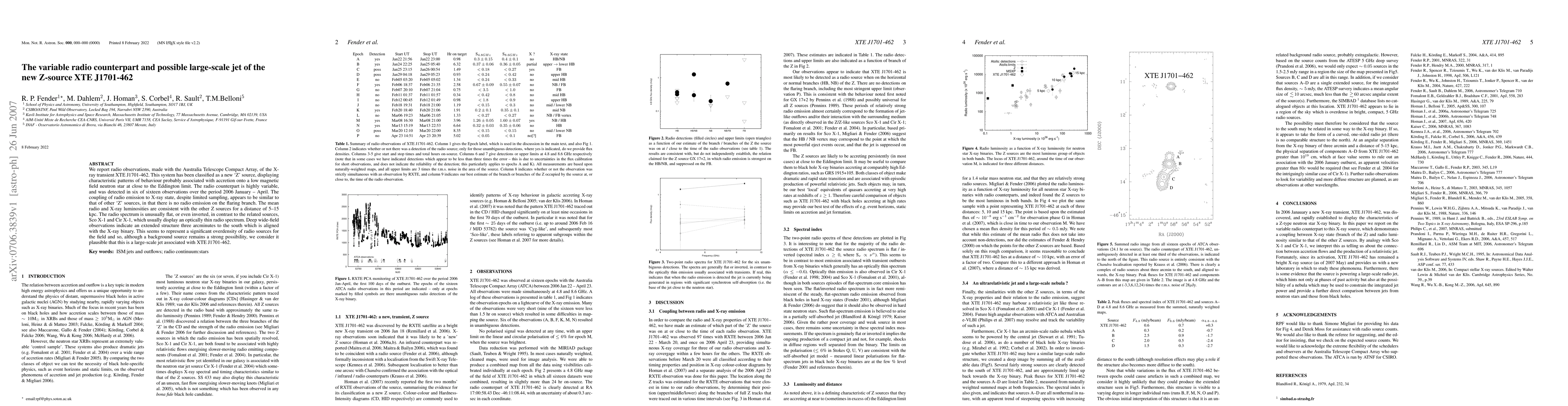 We report radio observations, made with the Australia Telescope Compact Array, of the X-ray transient XTE J1701-462. This system has been classified as a new `Z' source, displaying characteristic patterns of behaviour probably associated with accretion onto a low magnetic field neutron star at close to the Eddington limit. The radio counterpart is highly variable, and was detected in six of sixteen observations over the period 2006 January -- April. The coupling of radio emission to X-ray state, despite limited sampling, appears to be similar to that of other `Z' sources, in that there is no radio emission on the flaring branch. The mean radio and X-ray luminosities are consistent with the other Z sources for a distance of 5--15 kpc. The radio spectrum is unusually flat, or even inverted, in contrast to the related sources, Sco X-1 and Cir X-1, which usually display an optically thin radio spectrum. Deep wide-field observations indicate an extended structure three arcminutes to the south which is aligned with the X-ray binary. This seems to represent a significant overdensity of radio sources for the field and so, although a background source remains a strong possibility, we consider it plausible that this is a large-scale jet associated with XTE J1701-462.