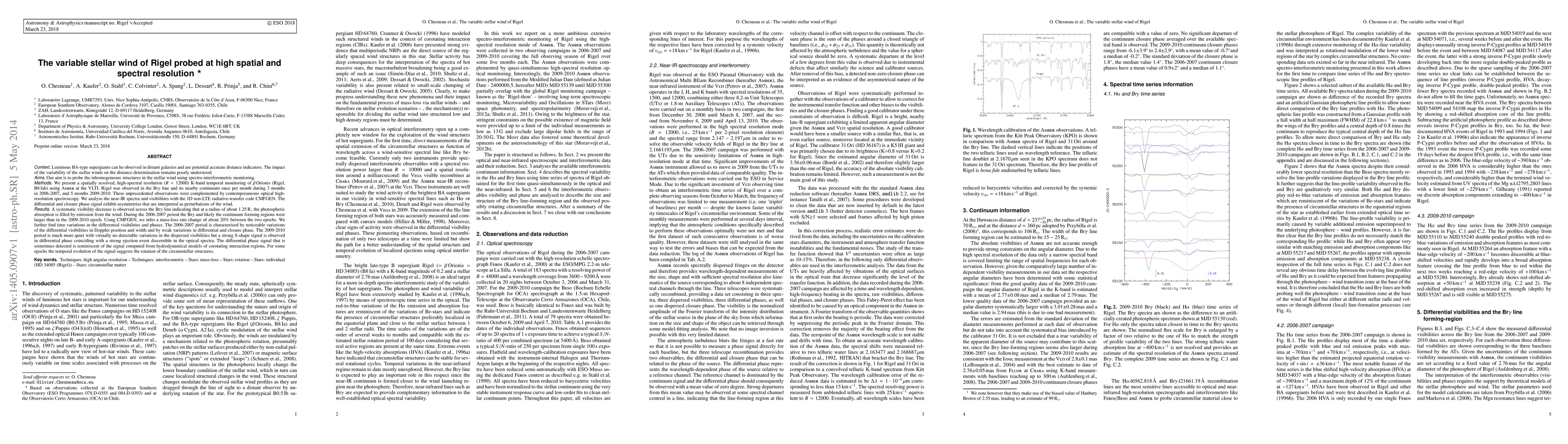 We present a spatially resolved, high-spectral resolution (R=12000) K-band temporal monitoring of Rigel using AMBER at the VLTI. Rigel was observed in the Bracket Gamma line and its nearby continuum in 2006-2007, and 2009-2010. These unprecedented observations were complemented by contemporaneous optical high-resolution spectroscopy. We analyse the near-IR spectra and visibilities with the 1D non-LTE radiative-transfer code CMFGEN. The differential and closure phase signal exhibit asymmetries that are interpreted as perturbations of the wind. A systematic visibility decrease is observed across the Bracket Gamma. During the 2006-2007 period the Bracket Gamma and likely the continuum forming regions were larger than in the 2009-2010 epoch. Using CMFGEN, we infer a mass-loss rate change of about 20% between the two epochs. We further find time variations in the differential visibilities and phases. The 2006-2007 period is characterized by noticeable variations of the differential visibilities in Doppler position and width and by weak variations in differential and closure phase. The 2009-2010 period is much more quiet with virtually no detectable variations in the dispersed visibilities but a strong S-shape signal is observed in differential phase coinciding with a strong ejection event discernible in the optical spectra. The differential phase signal that is sometimes detected is reminiscent of the signal computed from hydrodynamical models of corotating interaction regions. For some epochs the temporal evolution of the signal suggests the rotation of the circumstellar structures.