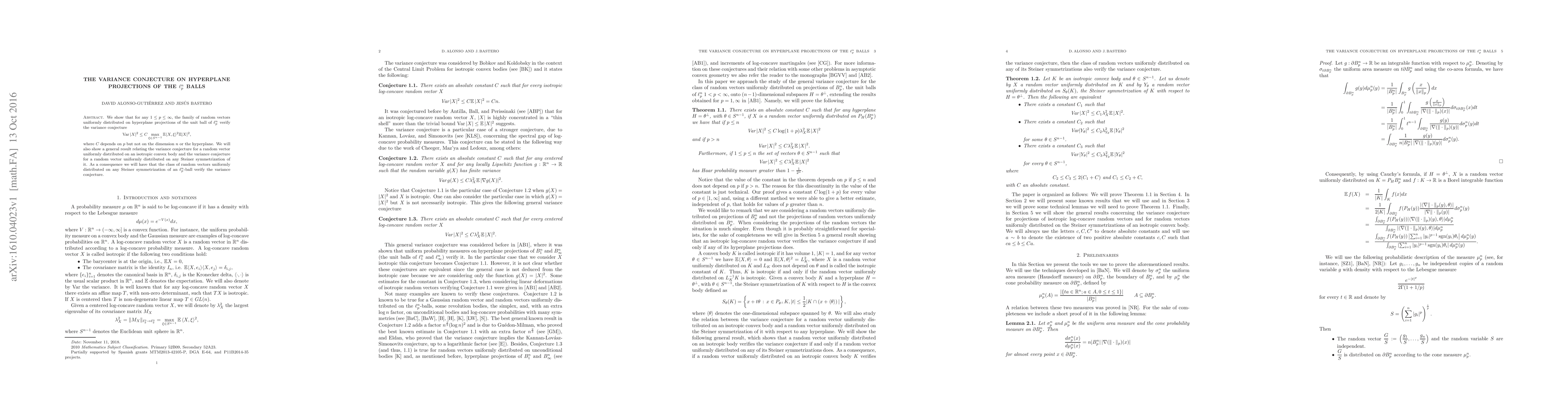 A research paper proves the variance conjecture for random vectors on hyperplane projections of unit balls in $oldsymbol{ ext{l}}_p^n$ space, showing a fixed constant $C$ depends only on $p$, not on dimension or hyperplane.