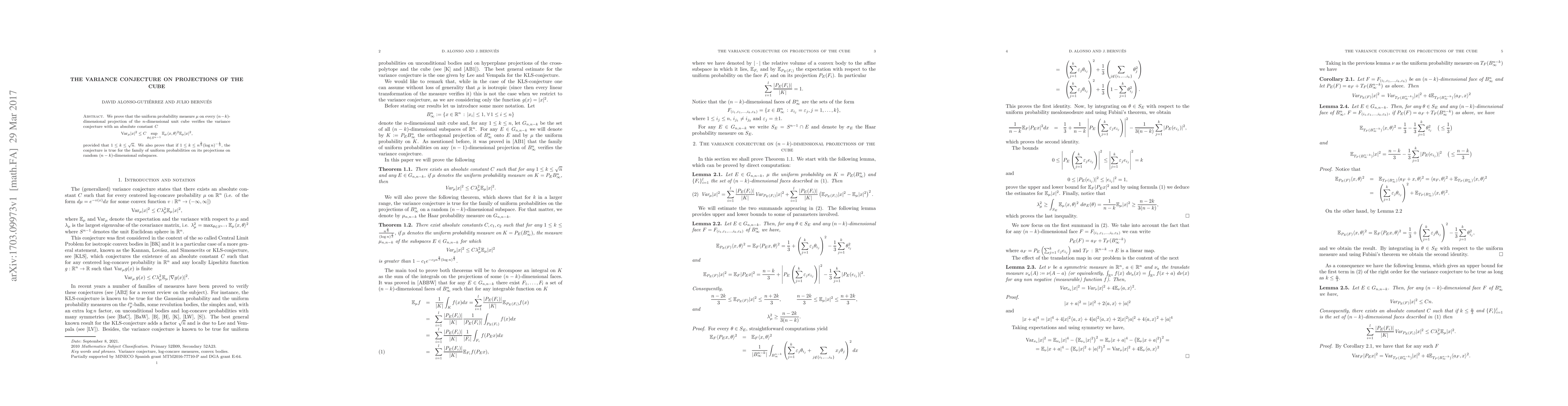 This research proves the variance conjecture for uniform probability measures on (n-k)-dimensional projections of the n-dimensional unit cube, given 1≤k≤√n, with a constant C. It also demonstrates the conjecture's validity for random (n-k)-dimensional subspaces when 1≤k≤n^(2/3)(log n)^(-1/3).