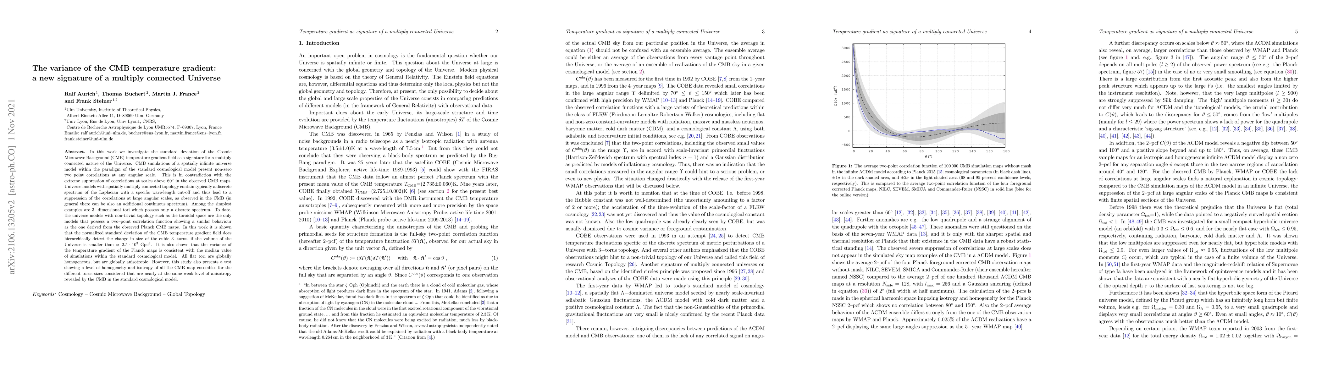 In this work we investigate the standard deviation of the Cosmic Microwave Background (CMB) temperature gradient field as a signature for a multiply connected nature of the Universe. CMB simulations of a spatially infinite universe model within the paradigm of the standard cosmological model present non-zero two-point correlations at any angular scale. This is in contradiction with the extreme suppression of correlations at scales above $60^{\circ}$ in the observed CMB maps. Universe models with spatially multiply connected topology contain typically a discrete spectrum of the Laplacian with a specific wave-length cut-off and thus lead to a suppression of the correlations at large angular scales, as observed in the CMB (in general there can be also an additional continuous spectrum). Among the simplest examples are 3-dimensional tori which possess only a discrete spectrum. To date, the universe models with non-trivial topology such as the toroidal space are the only models that possess a two-point correlation function showing a similar behaviour as the one derived from the observed Planck CMB maps. In this work it is shown that the normalized standard deviation of the CMB temperature gradient field does hierarchically detect the change in size of the cubic 3-torus, if the volume of the Universe is smaller than $\simeq 2.5 \cdot 10^3$ Gpc$^3$. It is also shown that the variance of the temperature gradient of the Planck maps is consistent with the median value of simulations within the standard cosmological model. All flat tori are globally homogeneous, but are globally anisotropic. However, this study also presents a test showing a level of homogeneity and isotropy of all the CMB map ensembles for the different torus sizes considered that are nearly at the same weak level of anisotropy revealed by the CMB in the standard cosmological model.