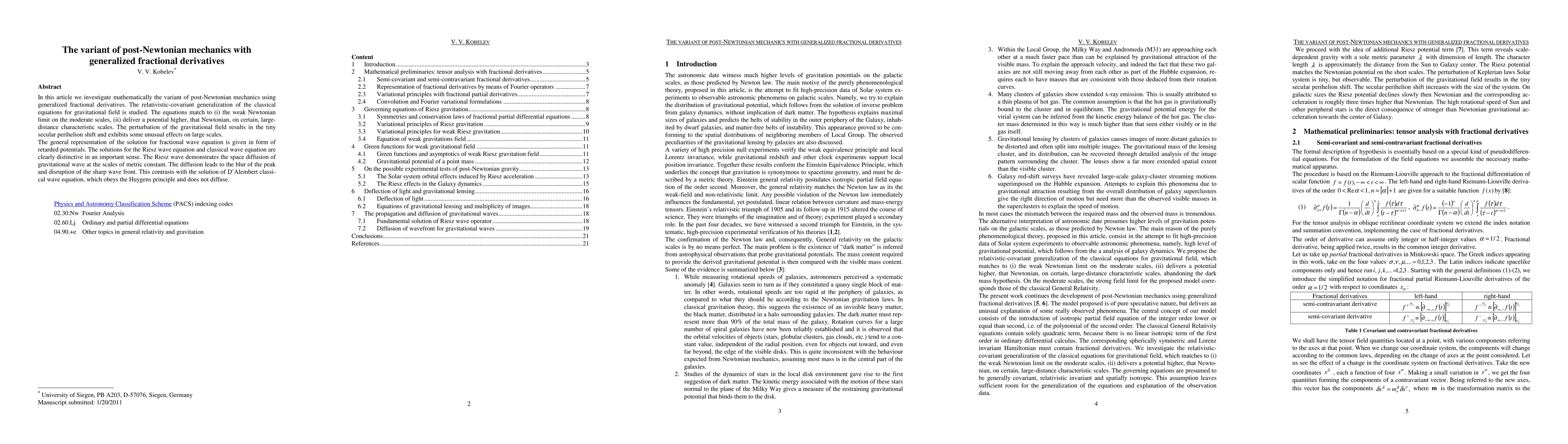 In this article we investigate mathematically the variant of post-Newtonian mechanics using generalized fractional derivatives. The relativistic-covariant generalization of the classical equations for gravitational field is studied. The equations match to (i) the weak Newtonian limit on the moderate scales, (ii) deliver a potential higher, that Newtonian, on certain, large-distance characteristic scales. The perturbation of the gravitational field results in the tiny secular perihelion shift and exhibits some unusual effects on large scales. The general representation of the solution for fractional wave equation is given in form of retarded potentials. The solutions for the Riesz wave equation and classical wave equation are clearly distinctive in an important sense. The Riesz wave demonstrates the space diffusion of gravitational wave at the scales of metric constant. The diffusion leads to the blur of the peak and disruption of the sharp wave front. This contrasts with the solution of D'Alembert classi-cal wave equation, which obeys the Huygens principle and does not diffuse.