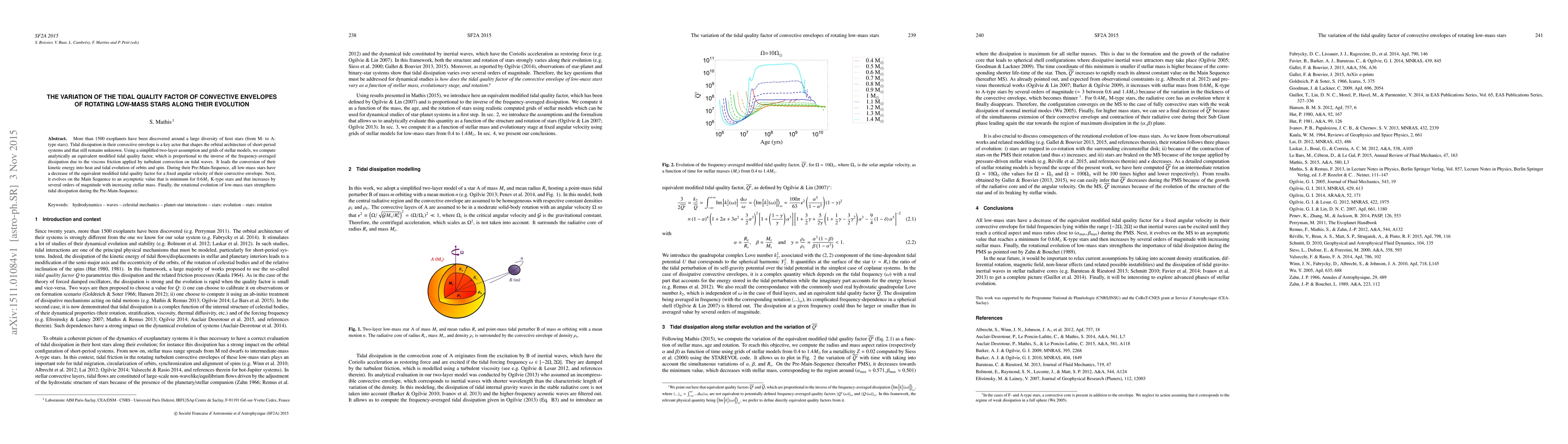 This paper explores how the tidal quality factor in the convective envelopes of low-mass rotating stars changes over their evolutionary stages. It finds that the tidal dissipation decreases during the Pre-Main-Sequence, stabilizes on the Main Sequence, and is lowest for $0.6M_{\odot}$ K-type stars, increasing significantly with higher stellar mass.
