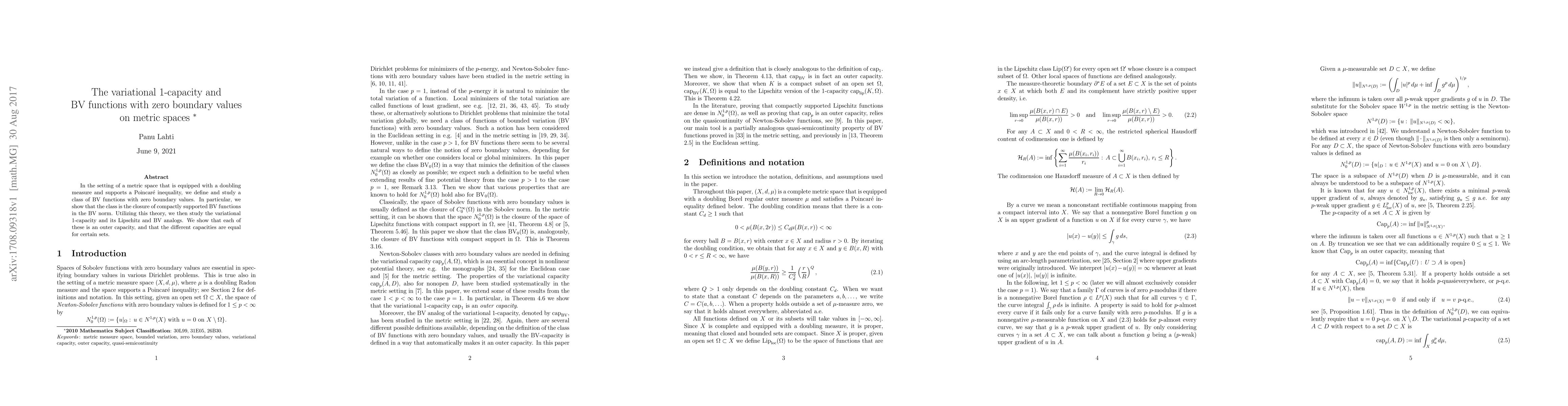 This paper defines and explores BV functions with zero boundary values on metric spaces with a doubling measure and Poincaré inequality. It establishes that this class is the closure of compactly supported BV functions and investigates the variational 1-capacity, proving it and its Lipschitz and BV analogs to be outer capacities that are equal for certain sets.