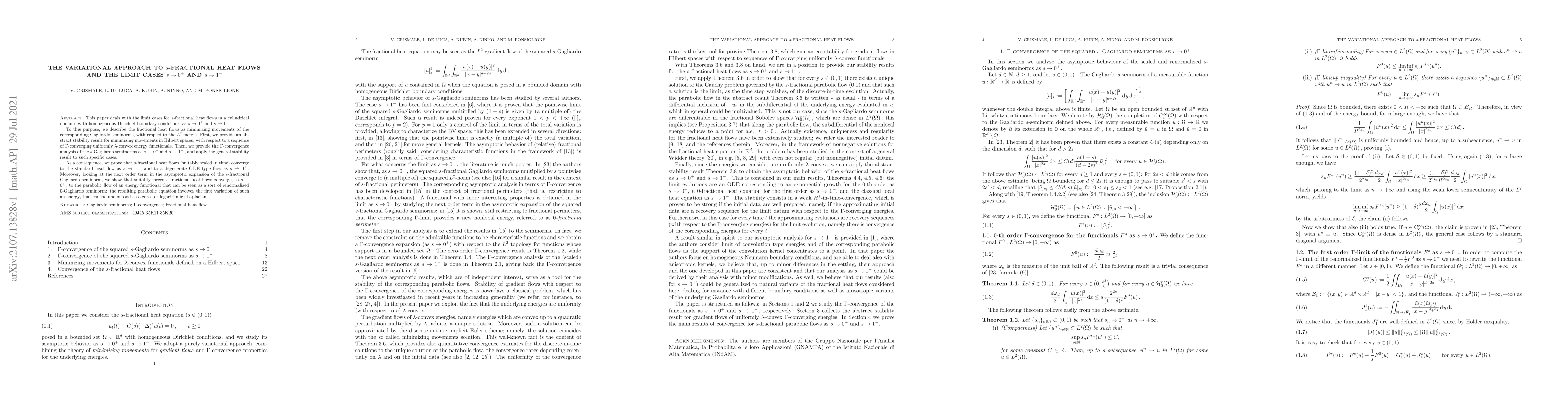 This paper deals with the limit cases for $s$-fractional heat flows in a cylindrical domain, with homogeneous Dirichlet boundary conditions, as $s\to 0^+$ and $s\to 1^-$\,. To this purpose, we describe the fractional heat flows as minimizing movements of the corresponding Gagliardo seminorms, with respect to the $L^2$ metric. First, we provide an abstract stability result for minimizing movements in Hilbert spaces, with respect to a sequence of $\Gamma$-converging uniformly $\lambda$-convex energy functionals. Then, we provide the $\Gamma$-convergence analysis of the $s$-Gagliardo seminorms as $s\to 0^+$ and $s\to 1^-$\,, and apply the general stability result to such specific cases. As a consequence, we prove that $s$-fractional heat flows (suitably scaled in time) converge to the standard heat flow as $s\to 1^-$, and to a degenerate ODE type flow as $s\to 0^+$\,. Moreover, looking at the next order term in the asymptotic expansion of the $s$-fractional Gagliardo seminorm, we show that suitably forced $s$-fractional heat flows converge, as $s\to 0^+$\,, to the parabolic flow of an energy functional that can be seen as a sort of renormalized $0$-Gagliardo seminorm: the resulting parabolic equation involves the first variation of such an energy, that can be understood as a zero (or logarithmic) Laplacian.