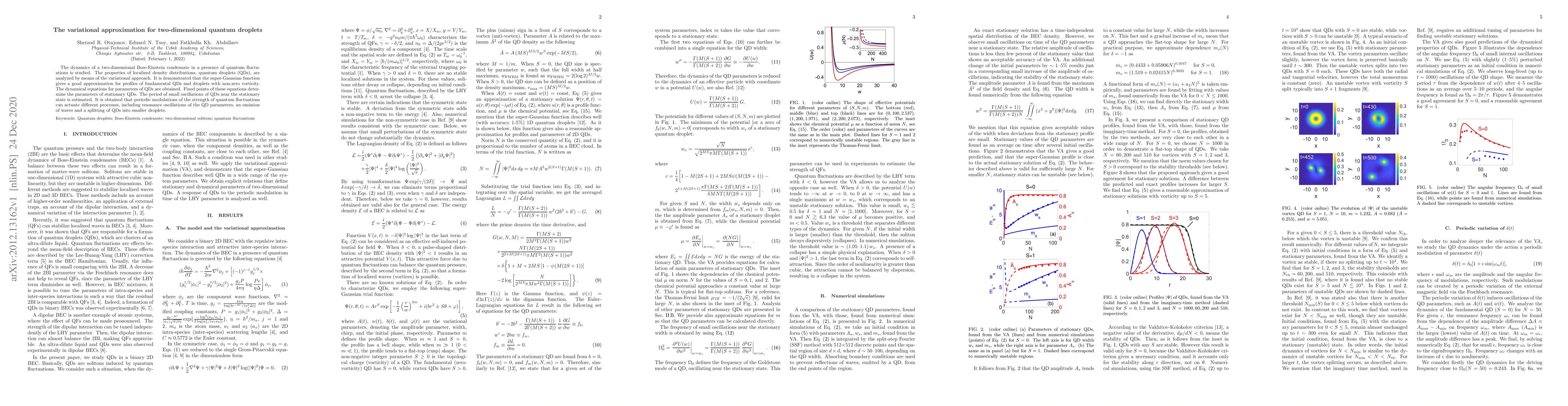 The dynamics of a two-dimensional Bose-Einstein condensate in a presence of quantum fluctuations is studied. The properties of localized density distributions, quantum droplets (QDs), are analyzed by means of the variational approach. It is demonstrated that the super-Gaussian function gives a good approximation for profiles of fundamental QDs and droplets with non-zero vorticity. The dynamical equations for parameters of QDs are obtained. Fixed points of these equations determine the parameters of stationary QDs. The period of small oscillations of QDs near the stationary state is estimated. It is obtained that periodic modulations of the strength of quantum fluctuations can actuate different processes, including resonance oscillations of the QD parameters, an emission of waves and a splitting of QDs into smaller droplets.