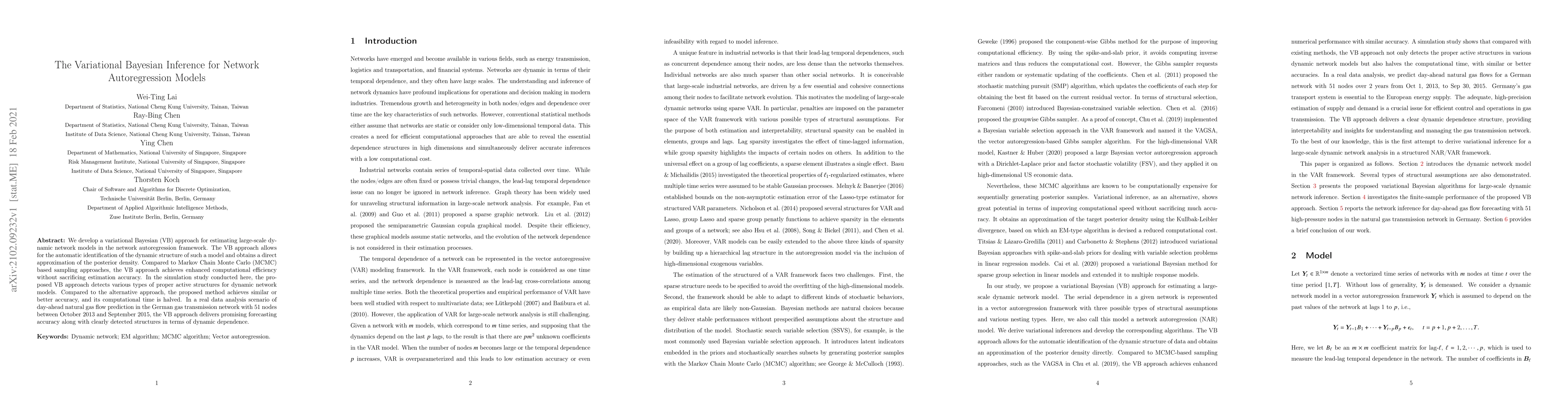 We develop a variational Bayesian (VB) approach for estimating large-scale dynamic network models in the network autoregression framework. The VB approach allows for the automatic identification of the dynamic structure of such a model and obtains a direct approximation of the posterior density. Compared to Markov Chain Monte Carlo (MCMC) based sampling approaches, the VB approach achieves enhanced computational efficiency without sacrificing estimation accuracy. In the simulation study conducted here, the proposed VB approach detects various types of proper active structures for dynamic network models. Compared to the alternative approach, the proposed method achieves similar or better accuracy, and its computational time is halved. In a real data analysis scenario of day-ahead natural gas flow prediction in the German gas transmission network with 51 nodes between October 2013 and September 2015, the VB approach delivers promising forecasting accuracy along with clearly detected structures in terms of dynamic dependence.