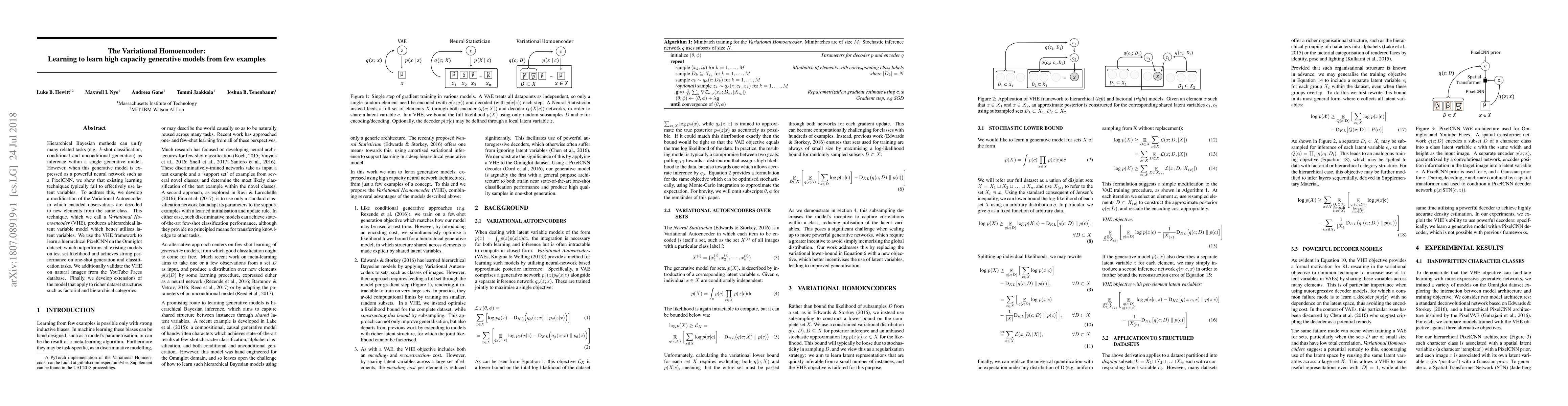 Hierarchical Bayesian methods can unify many related tasks (e.g. k-shot classification, conditional and unconditional generation) as inference within a single generative model. However, when this generative model is expressed as a powerful neural network such as a PixelCNN, we show that existing learning techniques typically fail to effectively use latent variables. To address this, we develop a modification of the Variational Autoencoder in which encoded observations are decoded to new elements from the same class. This technique, which we call a Variational Homoencoder (VHE), produces a hierarchical latent variable model which better utilises latent variables. We use the VHE framework to learn a hierarchical PixelCNN on the Omniglot dataset, which outperforms all existing models on test set likelihood and achieves strong performance on one-shot generation and classification tasks. We additionally validate the VHE on natural images from the YouTube Faces database. Finally, we develop extensions of the model that apply to richer dataset structures such as factorial and hierarchical categories.