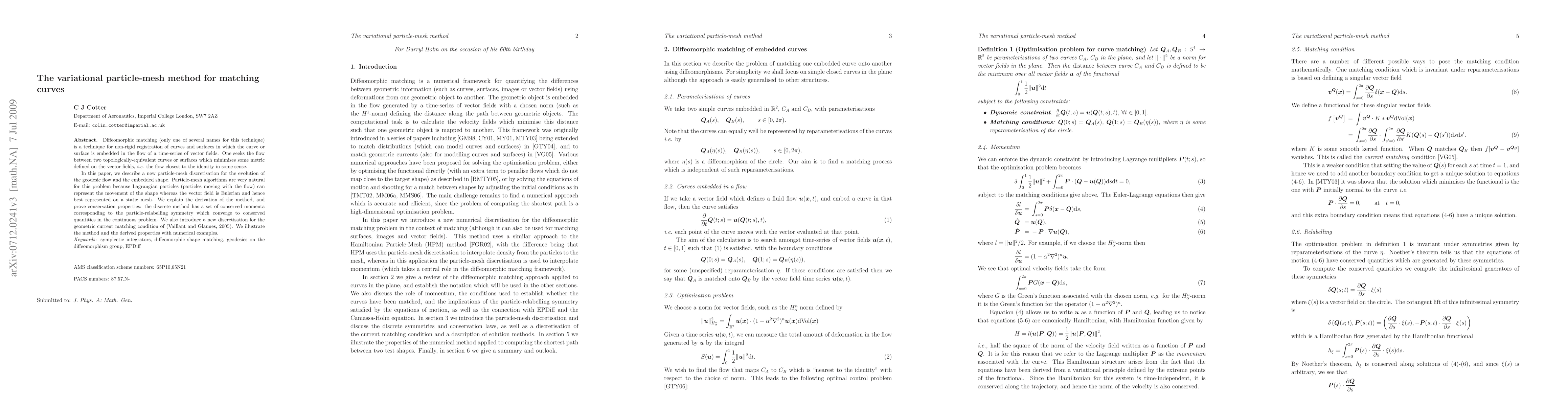 Diffeomorphic matching (only one of several names for this technique) is a technique for non-rigid registration of curves and surfaces in which the curve or surface is embedded in the flow of a time-series of vector fields. One seeks the flow between two topologically-equivalent curves or surfaces which minimises some metric defined on the vector fields, \emph{i.e.} the flow closest to the identity in some sense. In this paper, we describe a new particle-mesh discretisation for the evolution of the geodesic flow and the embedded shape. Particle-mesh algorithms are very natural for this problem because Lagrangian particles (particles moving with the flow) can represent the movement of the shape whereas the vector field is Eulerian and hence best represented on a static mesh. We explain the derivation of the method, and prove conservation properties: the discrete method has a set of conserved momenta corresponding to the particle-relabelling symmetry which converge to conserved quantities in the continuous problem. We also introduce a new discretisation for the geometric current matching condition of (Vaillant and Glaunes, 2005). We illustrate the method and the derived properties with numerical examples.